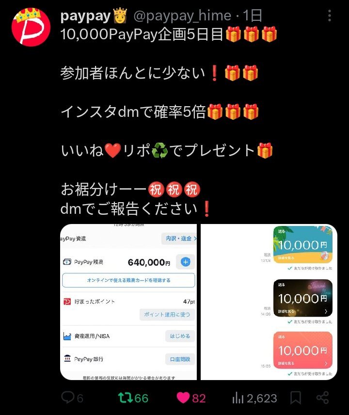 この人は詐欺です。面倒な条件をつけておいてPayPayは10円しか貰えませんでした。本人は縁がなかったと笑ってます。悪質なので晒します。皆さんも騙されないよう気をつけてください。見かけたら通報お願いします🙇‍♂️ #詐欺 #PayPay配布 #悪質 #注意喚起 #通報案件 pic.x.com/QAQV82Pxah