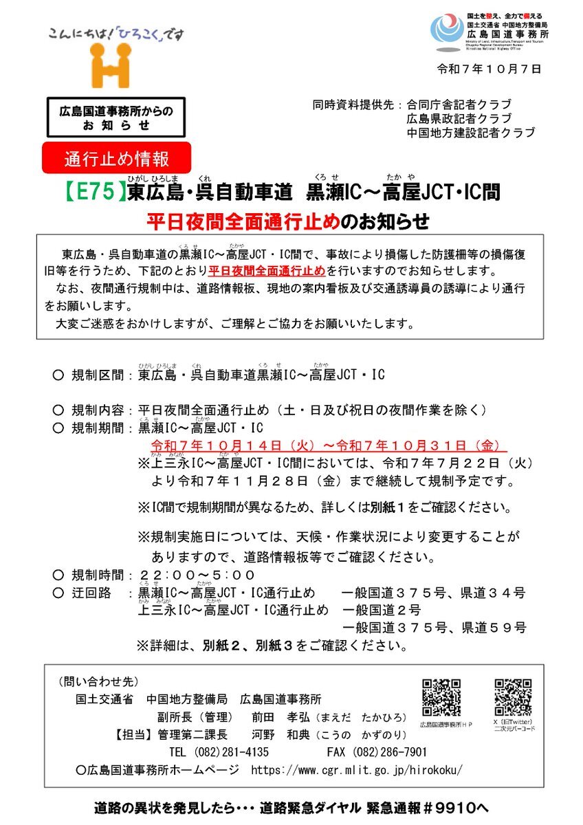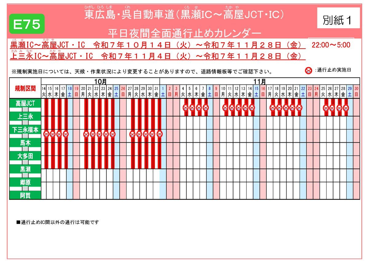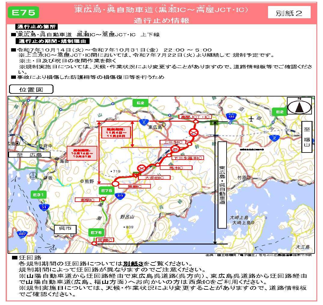 【#通行規制情報】 #東広島・呉自動車道 で,防護柵等の復旧作業のため,平日夜間通行止めを行います. 規制区間:黒瀬IC~高屋JCT・IC 10/14(火)~10/31(金) (上三永IC~高屋JCT・IC間は11/28(金)まで継続して規制予定) 通行の際は,迂回路をご利用ください. 詳しくは⇒cgr.mlit.go.jp/hirokoku/p_rel… #ひろこく
