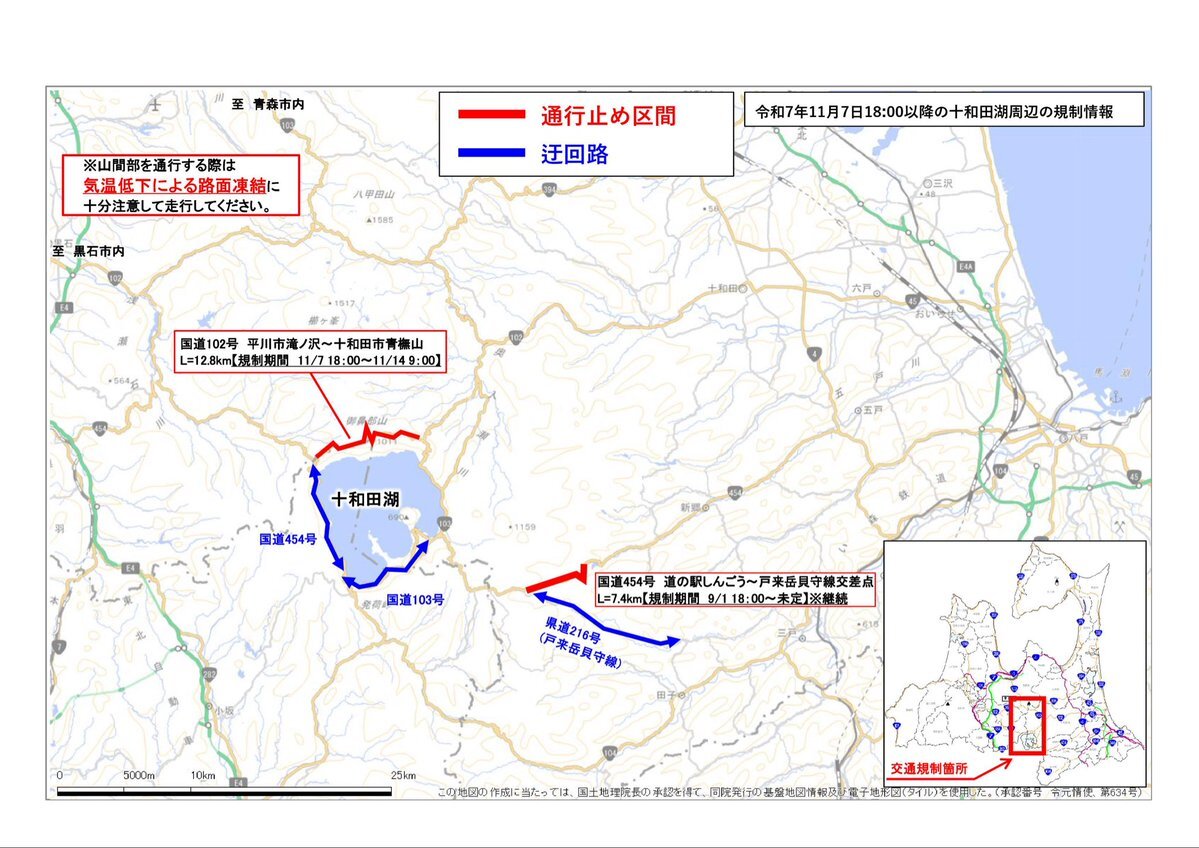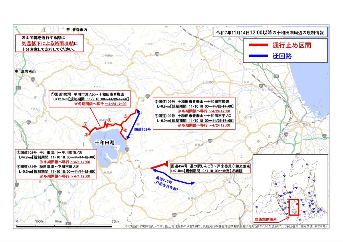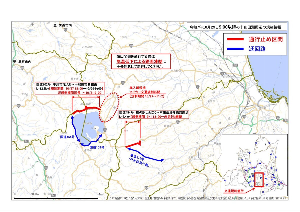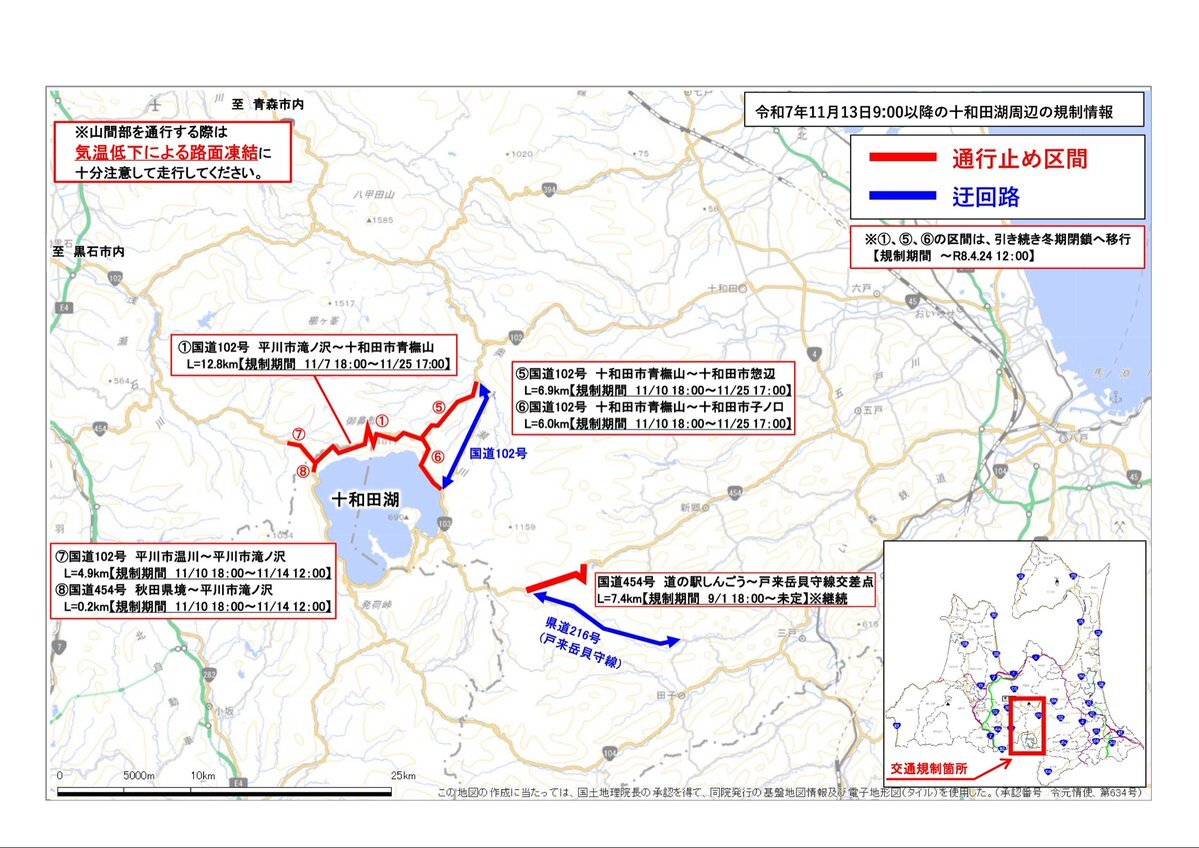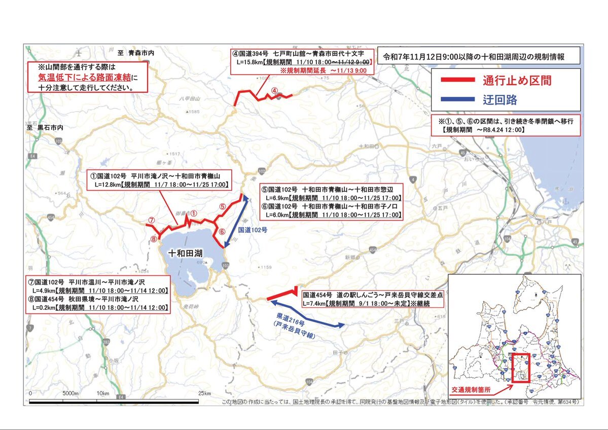 【#通行規制情報】 ①#国道102号 平川市滝ノ沢〜十和田市青橅山について全面通止め期間を延長します。 全面通行止めの区間④〜⑧(#十和田湖 周辺)を新たに追加します。 (①、⑤、⑥の区間は、引き続き冬季閉鎖に移行します) 詳細は以下の画像の通りです。 付近を走行する際はご注意ください。 pic.x.com/nz0EH8clf4 x.com/aomoriken_dour…