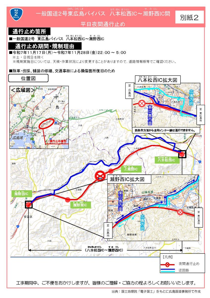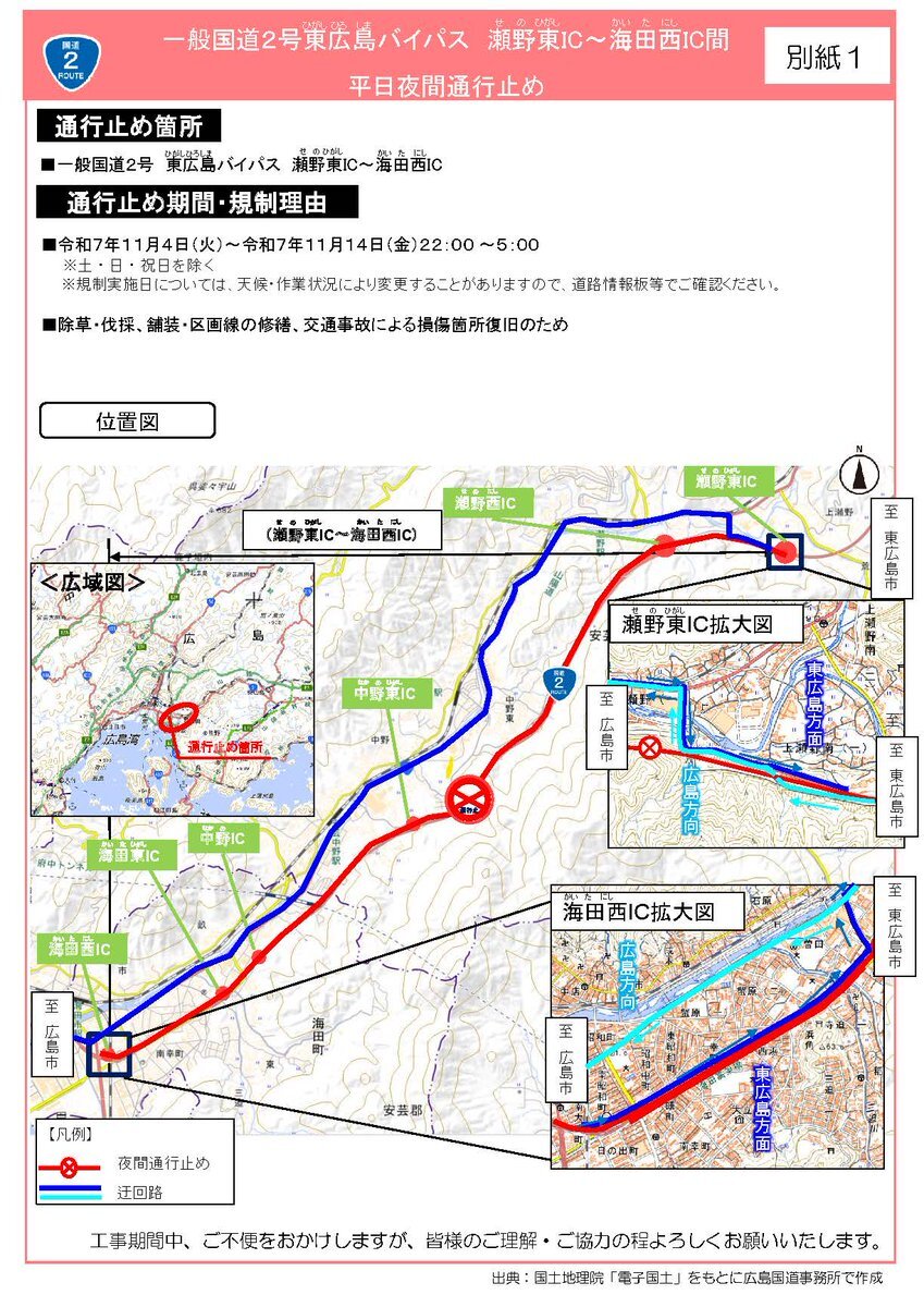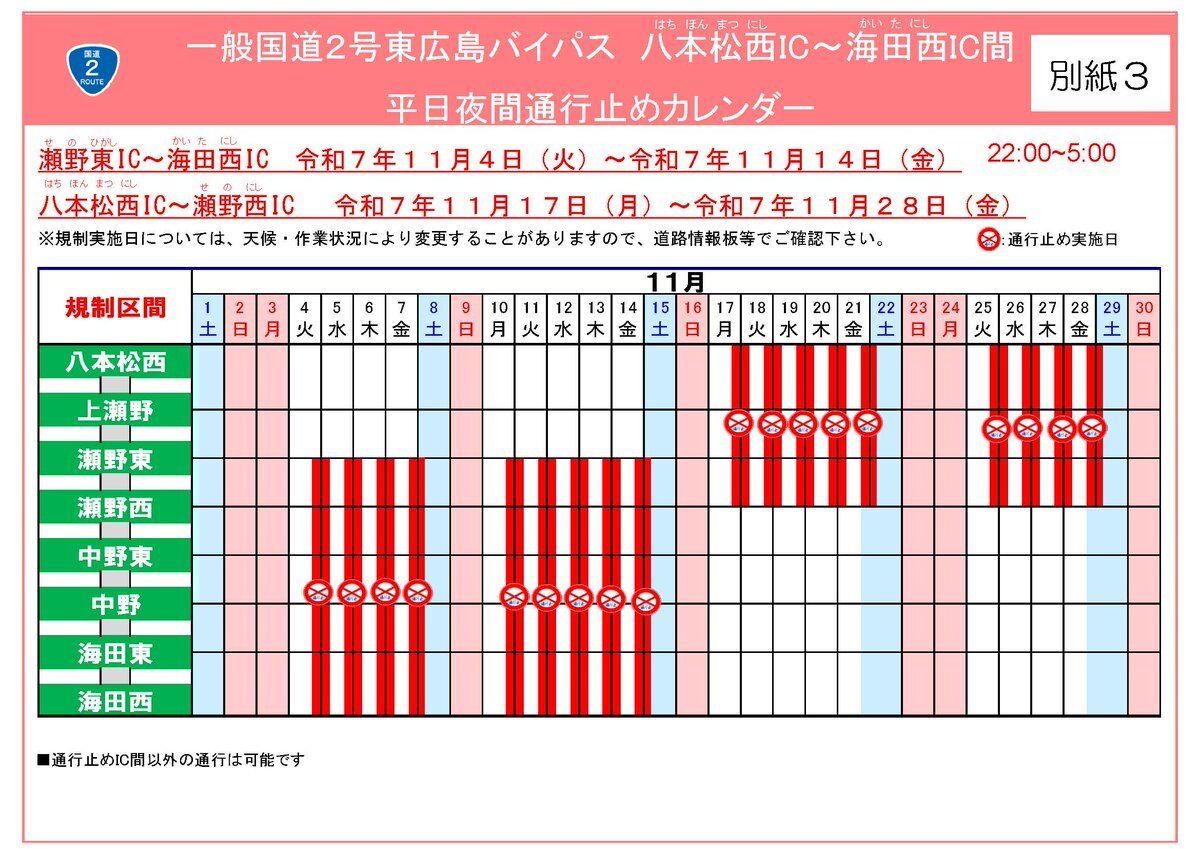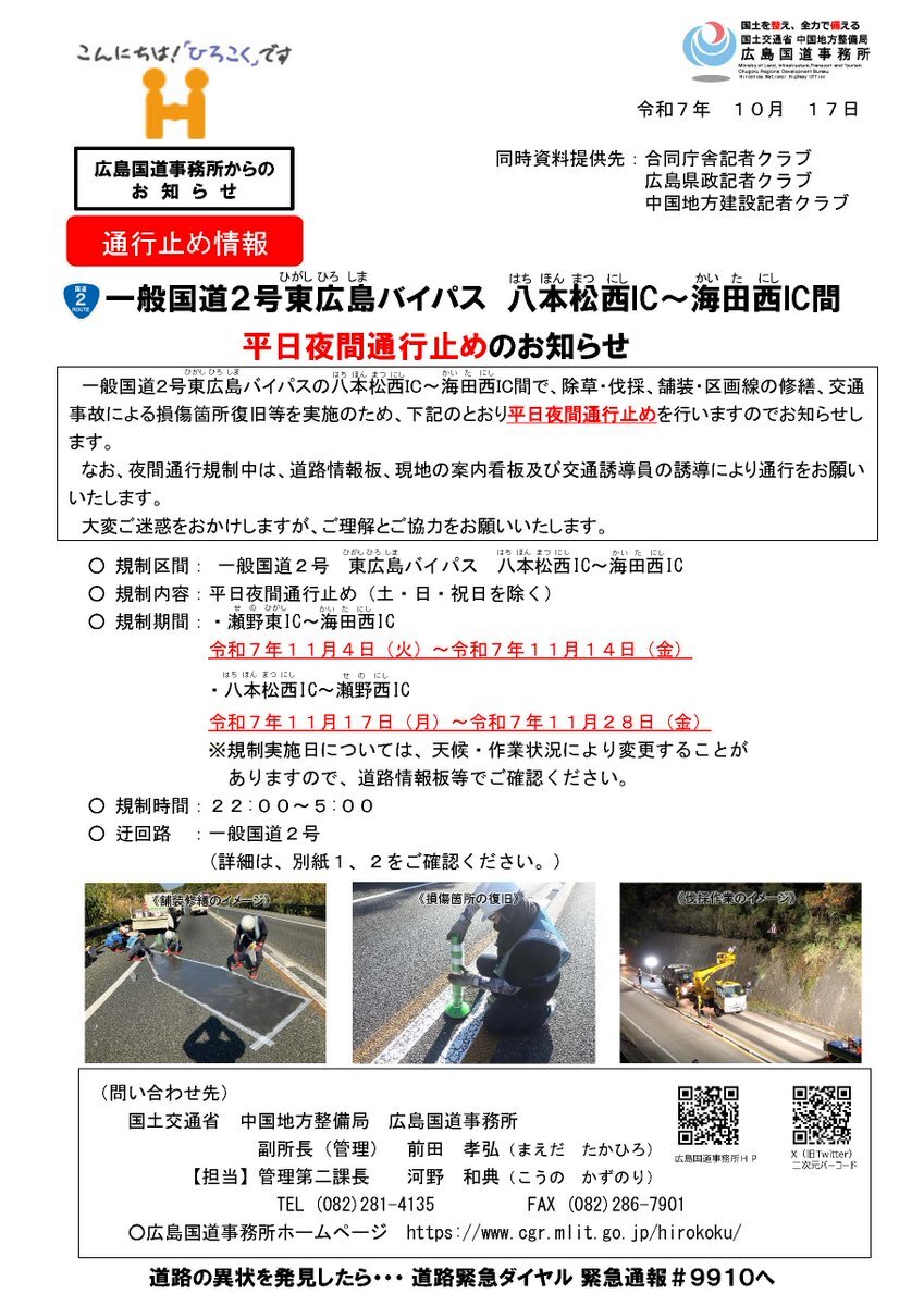 【#通行規制情報】 一般 #国道2号 #東広島バイパス で,損傷箇所復旧等のため,平日夜間通行止めを行います. 規制区間:瀬野東IC~海田西IC 11/4(火)~11/14(金) 八本松西IC~瀬野西IC 11/17(月)~11/28(金) 通行の際は,迂回路をご利用ください. 詳しくは⇒cgr.mlit.go.jp/hirokoku/p_rel… #ひろこく pic.x.com/naIqgHMuaZ