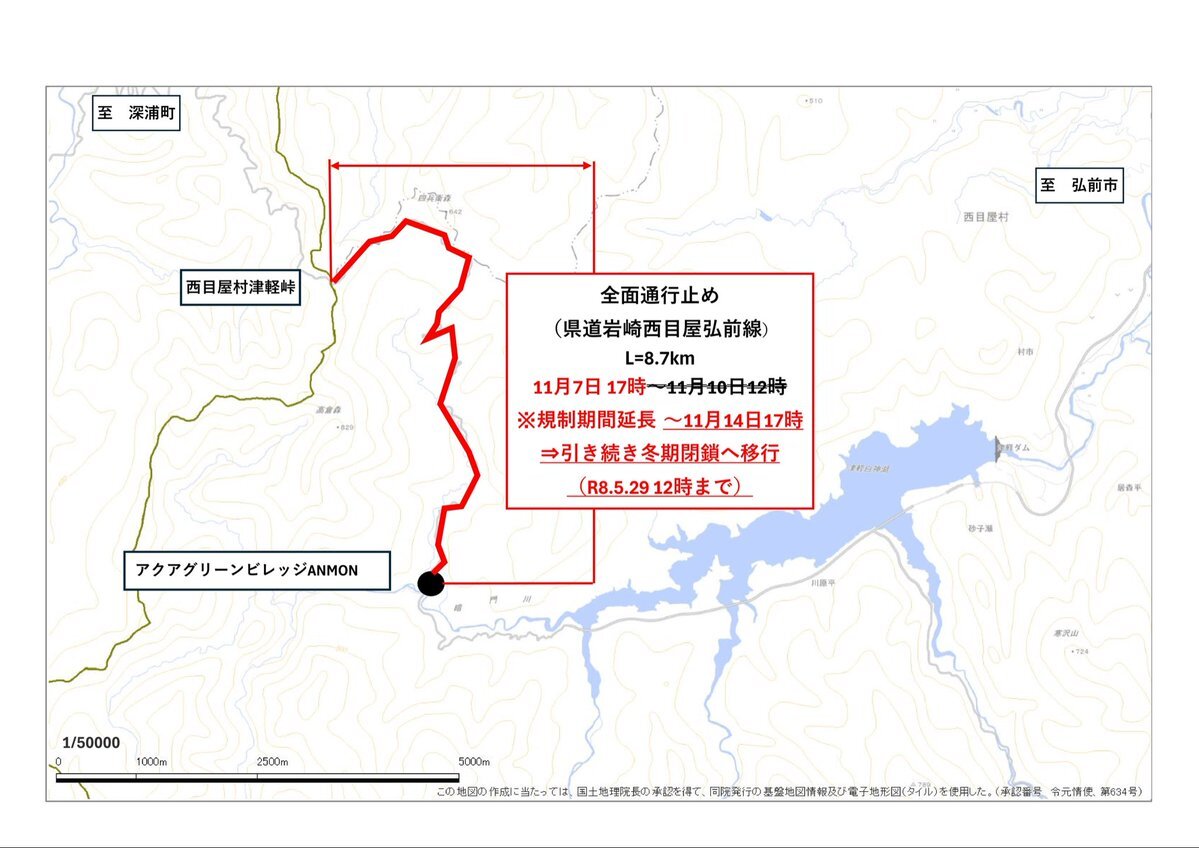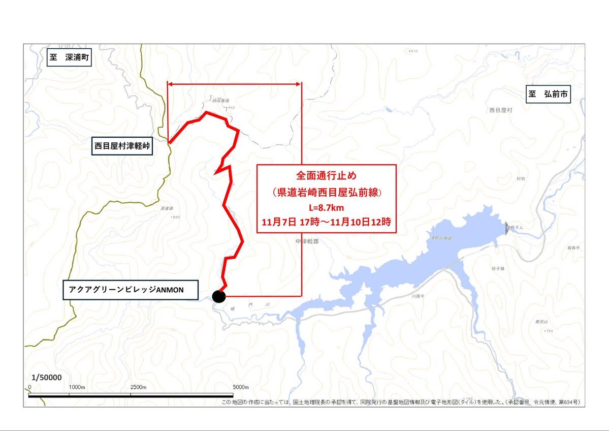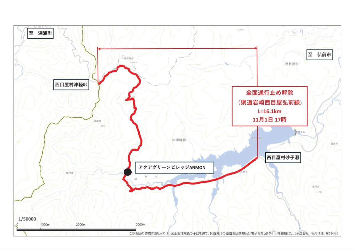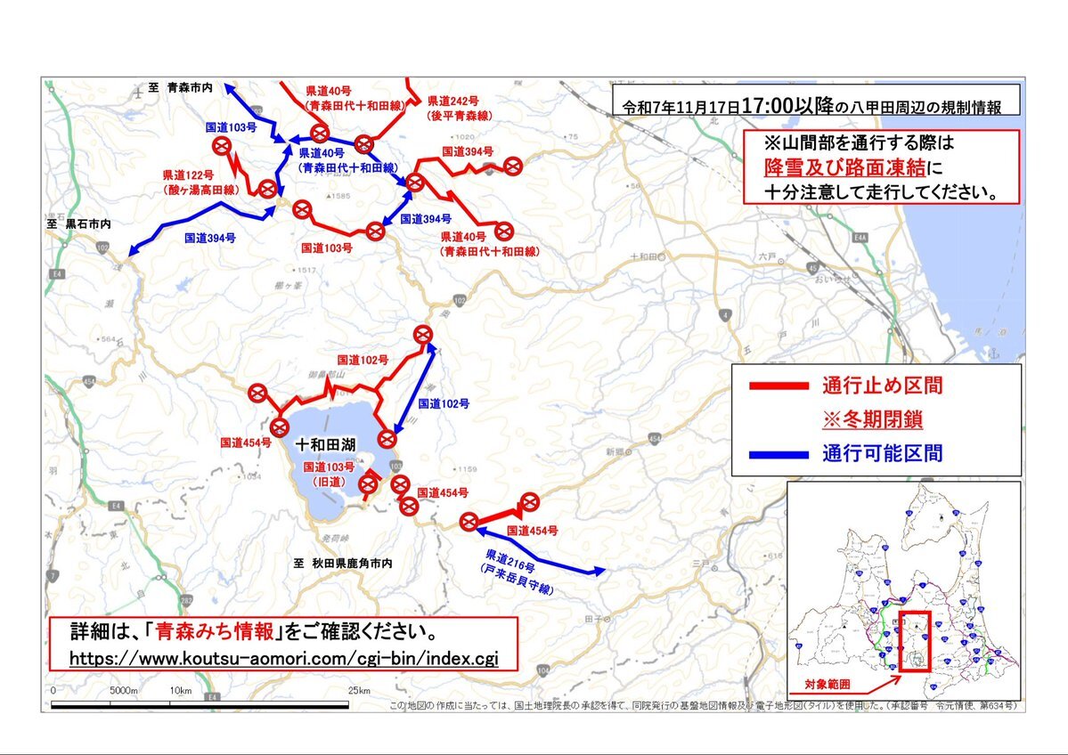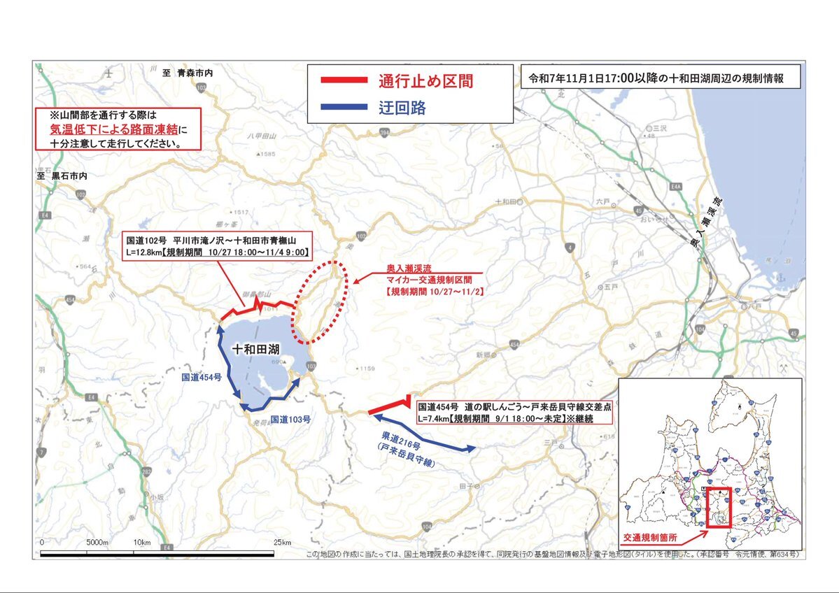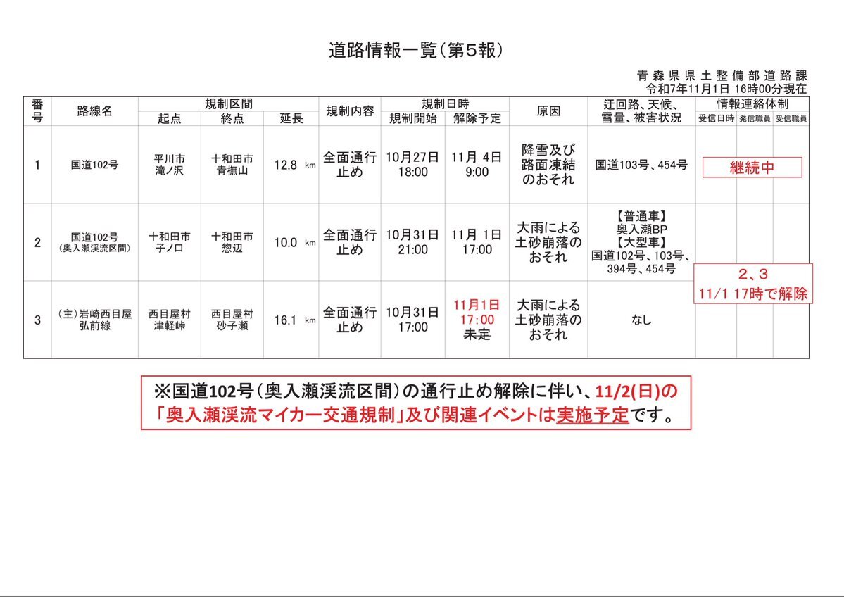 【#通行規制情報】 #国道102号(奥入瀬渓流区間)十和田市子ノ口〜十和田市惣辺 #岩崎西目屋弘前線 西目屋村津軽峠〜西目屋村砂子瀬 において、11月1日17時に全面通行止めを解除します。 詳細は下記の通りです。(11月1日17:00時点) 付近を走行する際はご注意ください。 pic.x.com/zSdu7Of12k