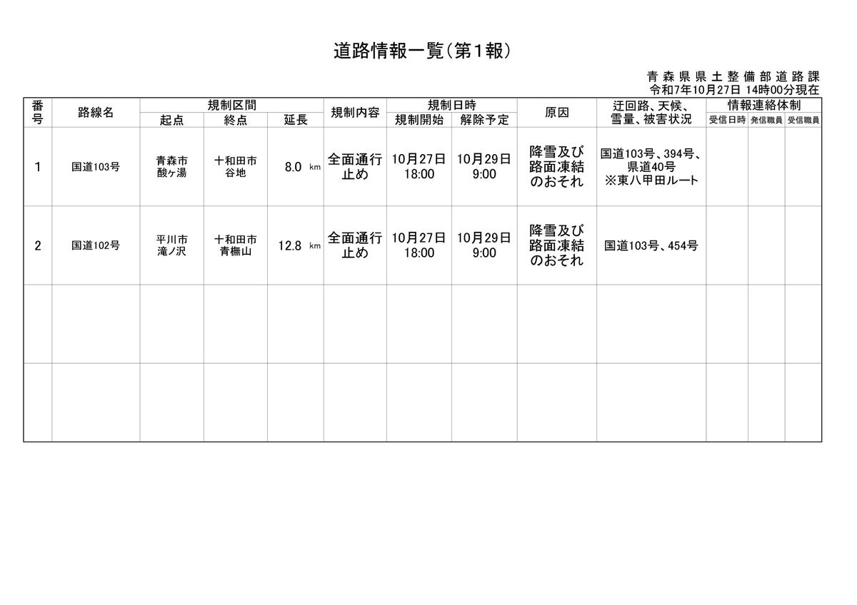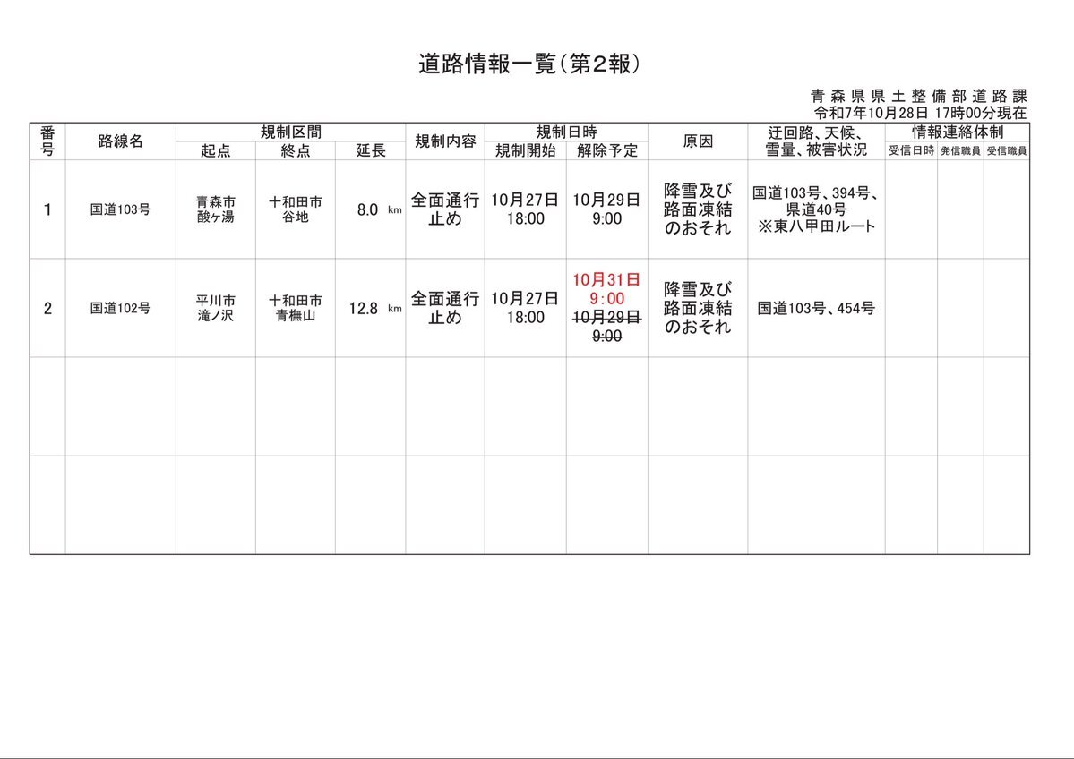 【#通行規制情報】 ②#国道102号 平川市滝ノ沢〜十和田市青橅山 において、降雪及び路面凍結のおそれがあるため、全面通行止めを実施していますが、規制期間を延長します。 詳細は、以下の画像のとおりです。(10/28 17:00時点) 付近を走行する際はご注意ください。 pic.x.com/4MKJVG0mlE x.com/aomoriken_dour…