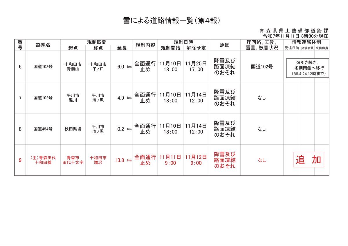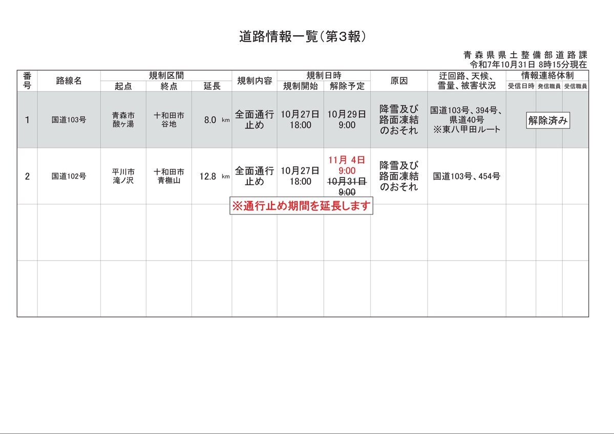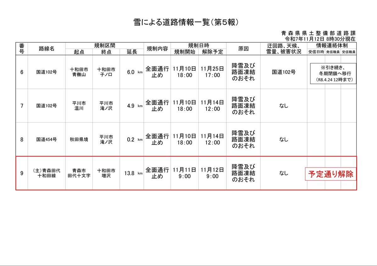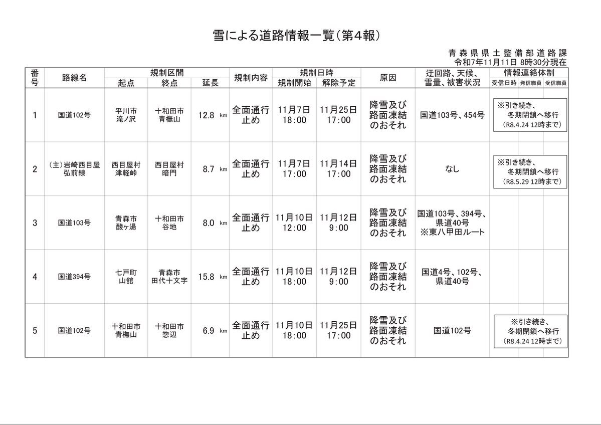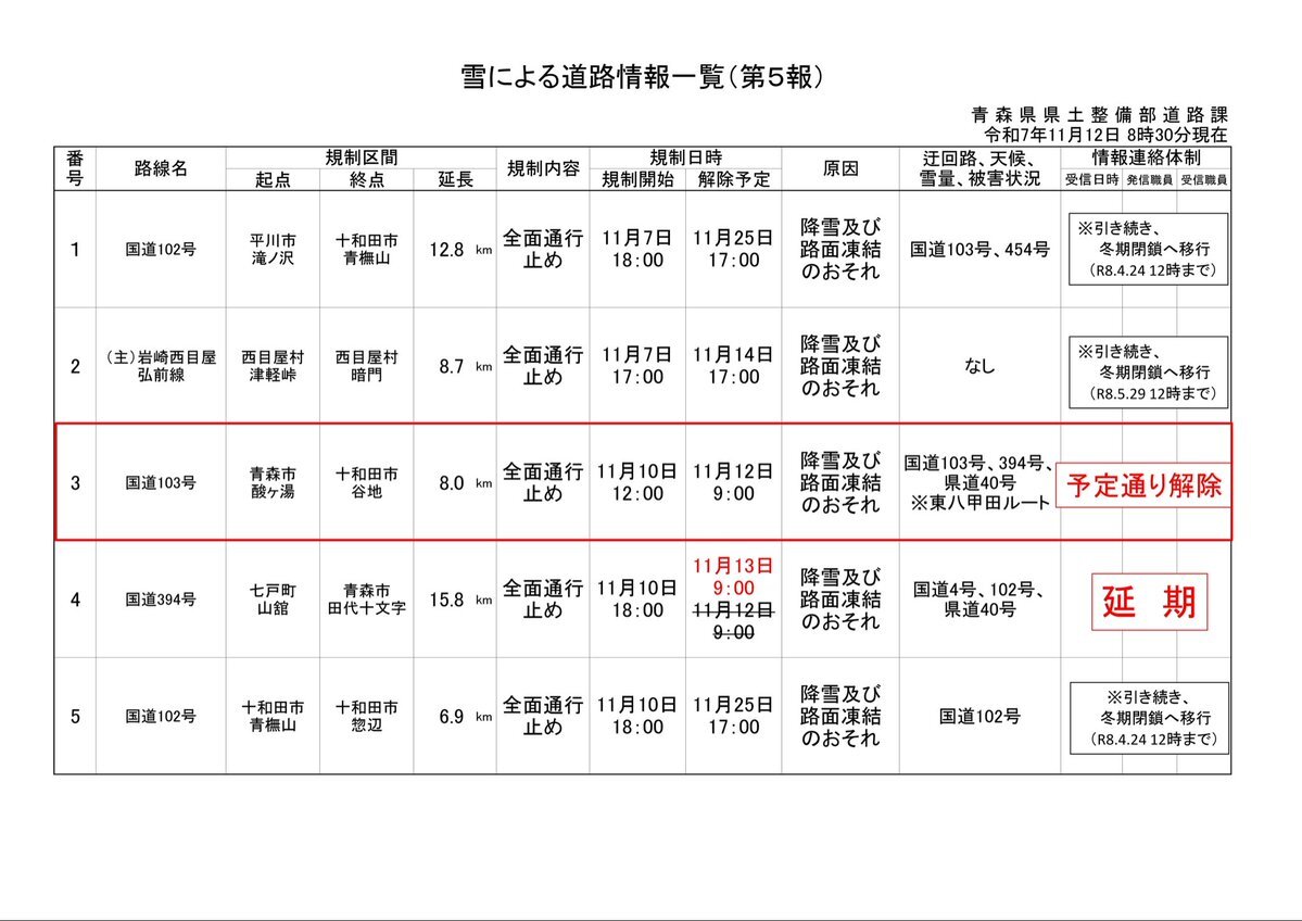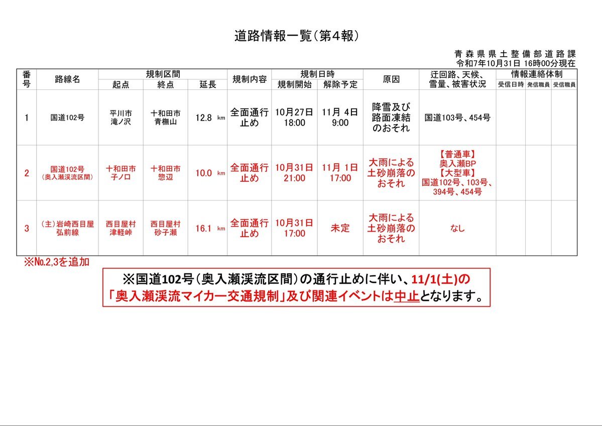 【#通行規制情報】 #国道102号 平川市滝ノ沢〜十和田市青橅山の通行規制は、4日9時で解除します。 詳細は下記画像の通りです。(11月4日9:00時点) 引続き、山間部を走行する際は、気温低下による路面凍結に注意して走行して下さい。 pic.x.com/8wQTYOv3Kt x.com/aomoriken_dour…
