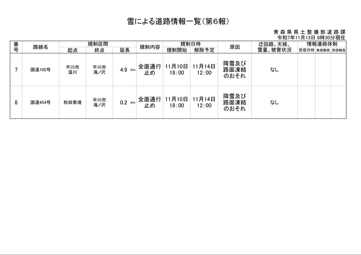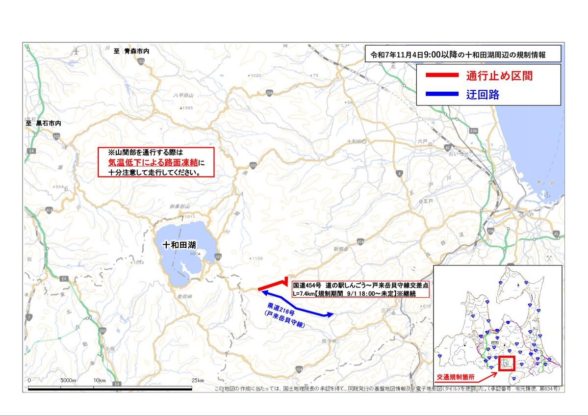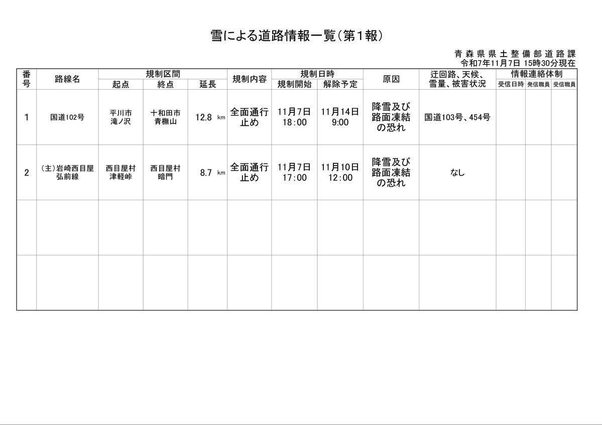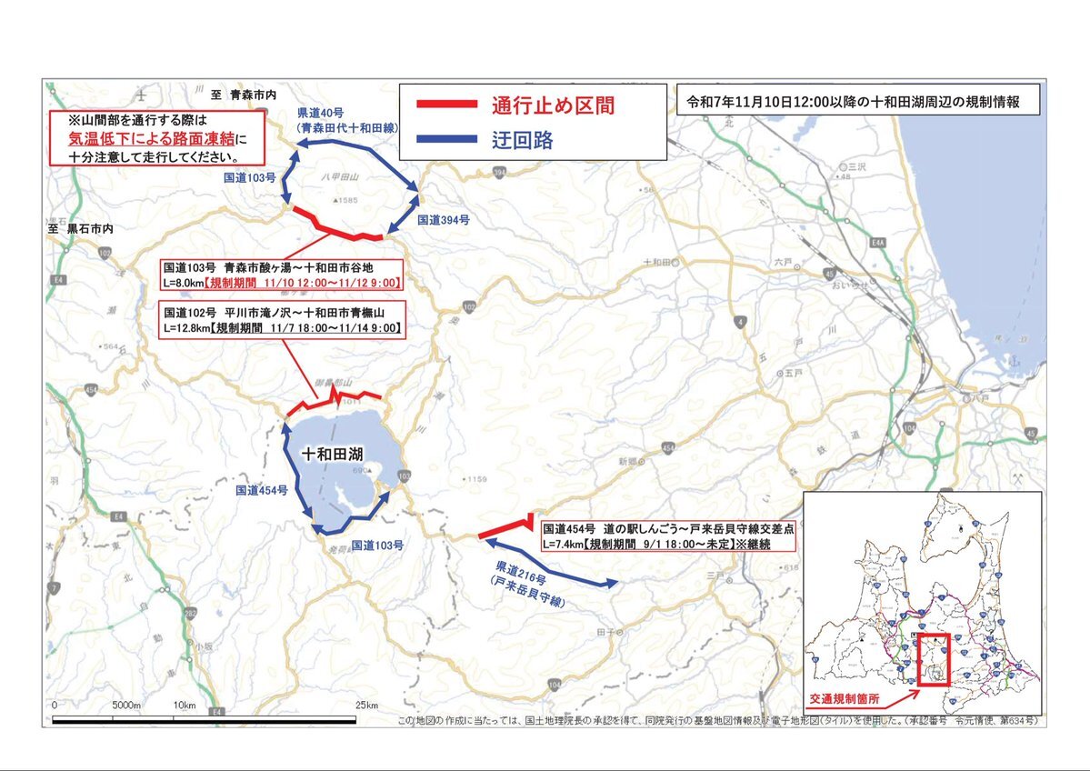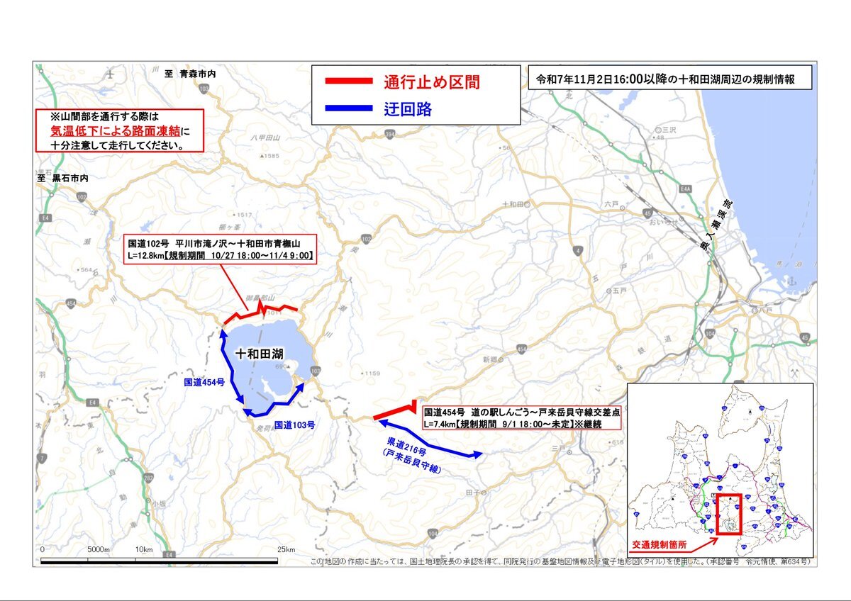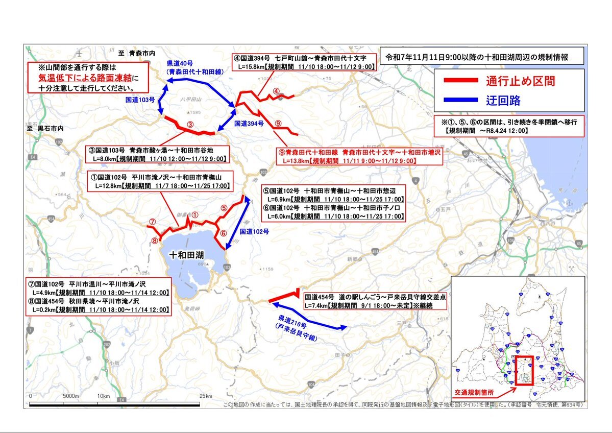 【#通行規制情報】 #国道102号 平川市滝ノ沢〜十和田市青橅山の通行規制は、4日9時で解除します。 詳細は下記画像の通りです。(11月4日9:00時点) 引続き、山間部を走行する際は、気温低下による路面凍結に注意して走行して下さい。 pic.x.com/8wQTYOv3Kt x.com/aomoriken_dour…