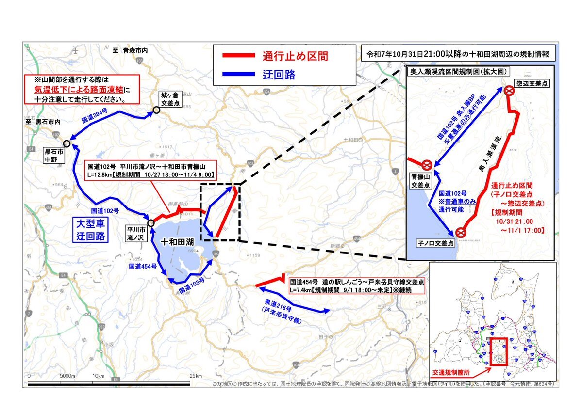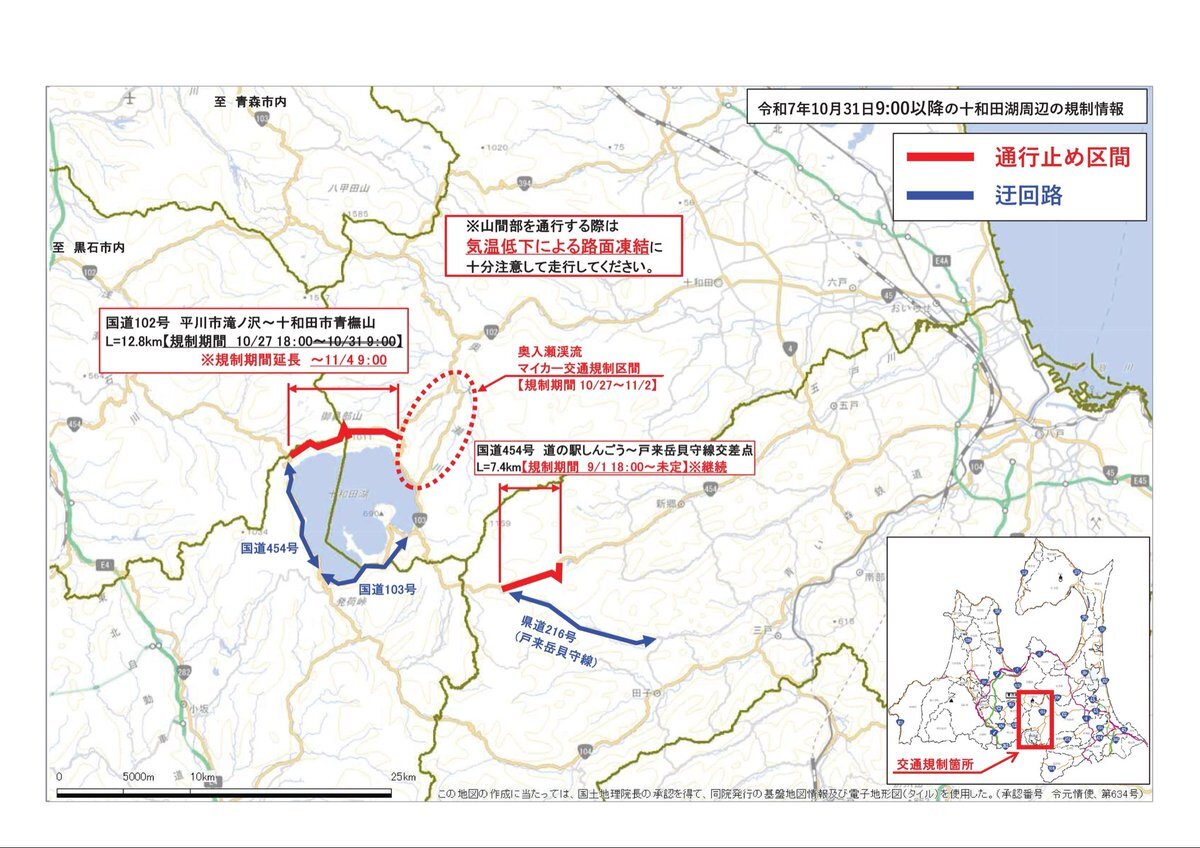 【#通行規制情報】 ②#国道102号 平川市滝ノ沢〜十和田市青橅山において、降雪及び路面凍結の恐れがあるため、全面通行止めを期間延長します。 詳細は下記画像の通りです。(10月31日9:00時点) 付近を走行する際はご注意ください。 pic.x.com/sMxLFbMrIM x.com/aomoriken_dour…