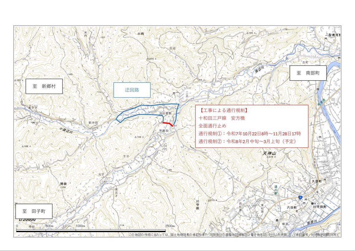 【#通行規制情報】 #十和田三戸線 安方橋の橋梁補修工事に伴い、24時間の #全面通行止め を実施します。周辺迂回路にて、朝夕混雑が予想されますので、ご協力をお願いします。 規制期間は下記のとおりです。 ① 令和7年10月22日8時~11月28日17時 ② 令和8年2月中旬~3月上旬(予定) #青森県 #三戸町