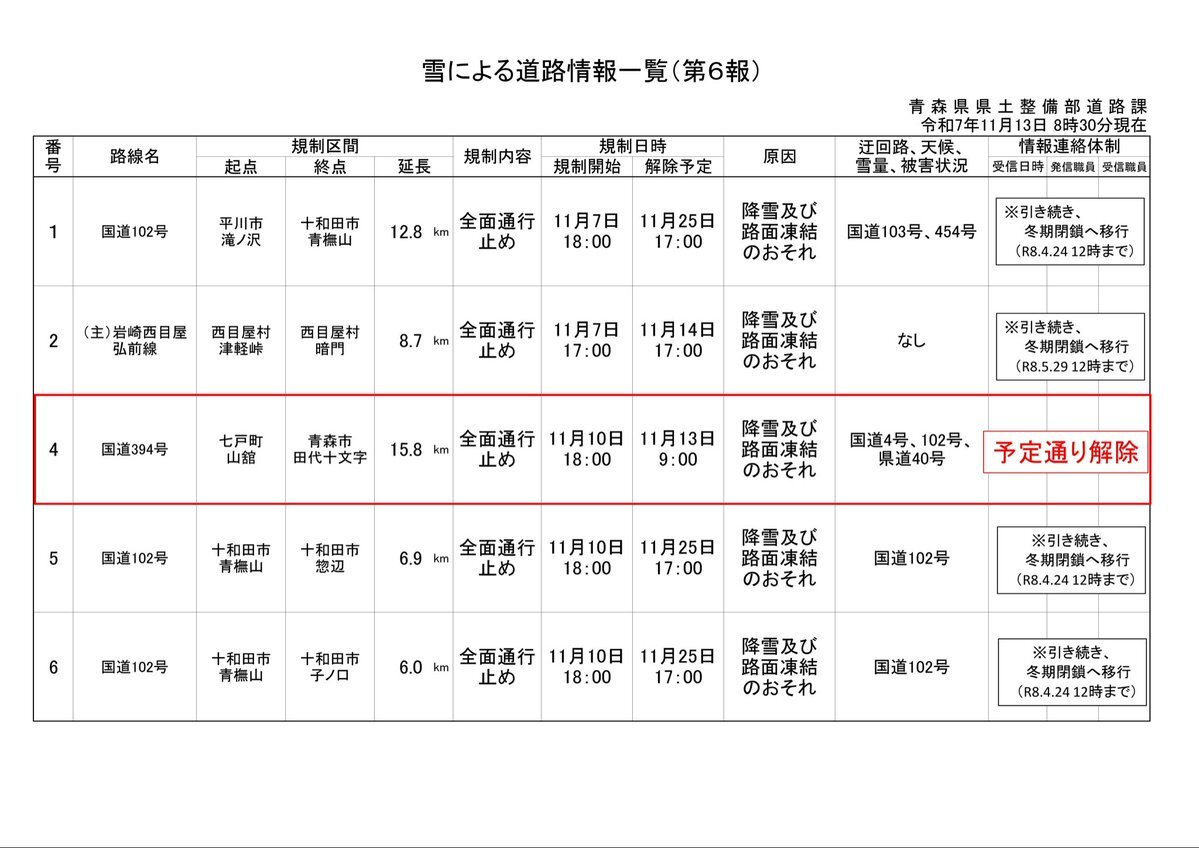 【#通行規制情報】 ④#国道394号 七戸町山舘〜青森市田代十文字の通行規制は、13日9時で解除します。 詳細は下記の通りです。 引き続き山間部を走行する際は、路面凍結にご注意ください。 pic.x.com/BxQpq5U1N9