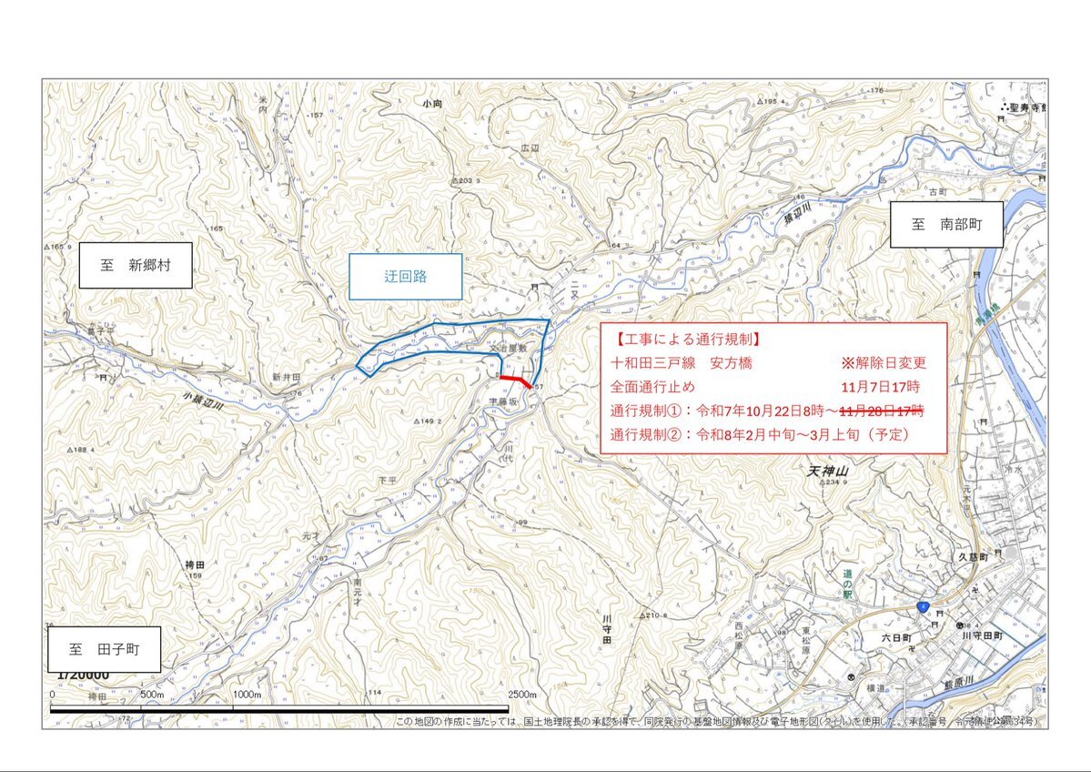 【#通行規制情報】 #十和田三戸線 安方橋の橋梁補修工事に伴う、1回目の通行規制(終日通行止め)について、施工進捗の影響により、通行規制の解除日が変更となります。 変更前)11月28日17時 変更後)11月7日17時 #青森県 #三戸町 pic.x.com/vDsm2uJZk7 x.com/sanpachi38kend…