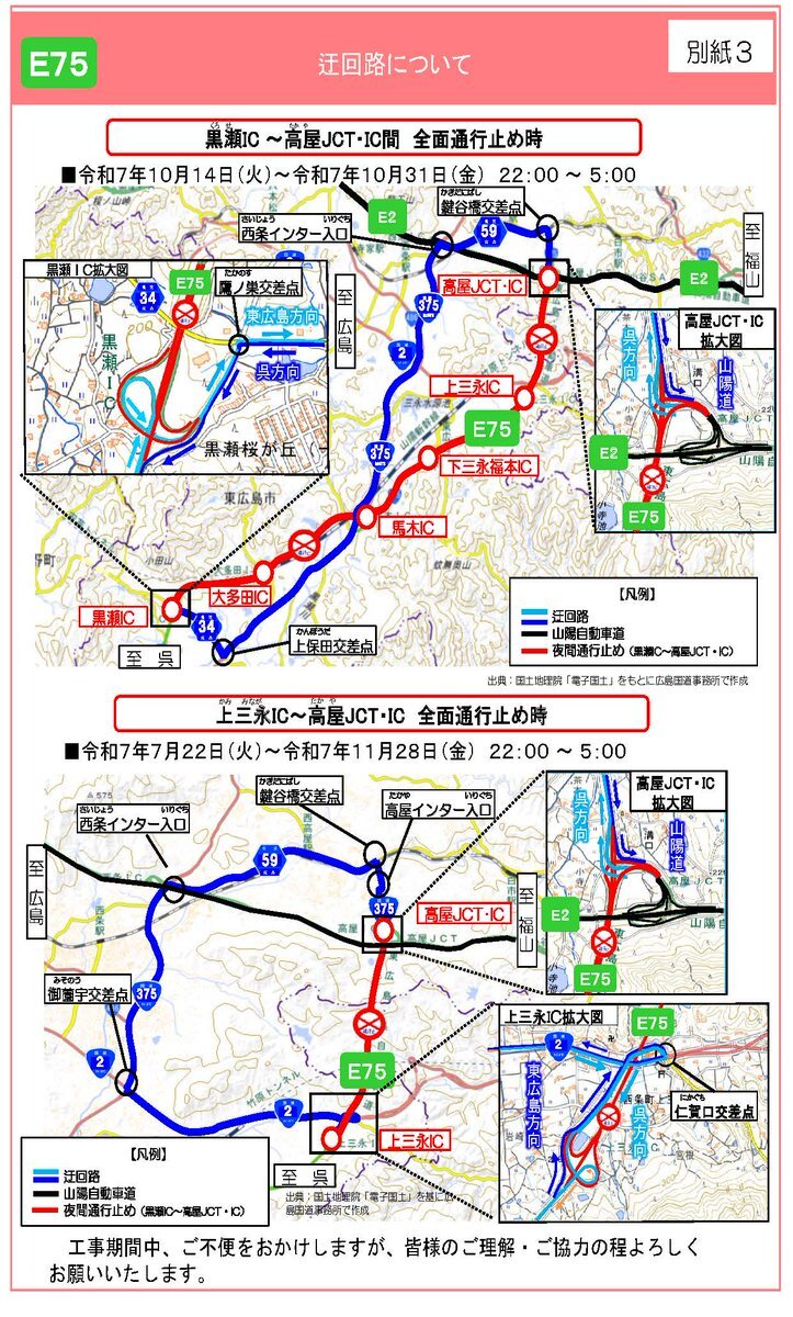 【#通行規制情報】 #東広島・呉自動車道で、損傷箇所復旧等のため平日夜間通行止めとしていましたが、現地作業状況により規制期間が短縮できましたので下記に変更します。 規制区間:上三永IC~高屋JCT・IC 7/22(火)~11/19(水) #ひろこく x.com/mlit_hirokoku/…