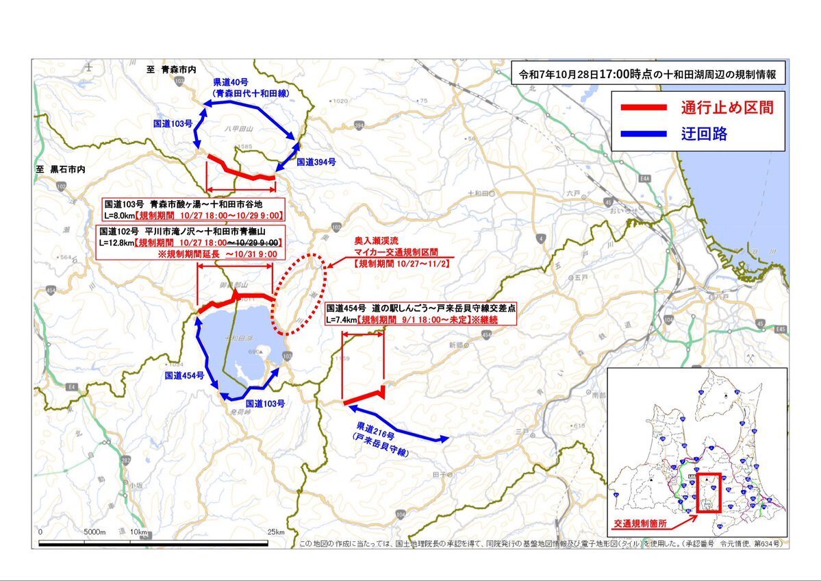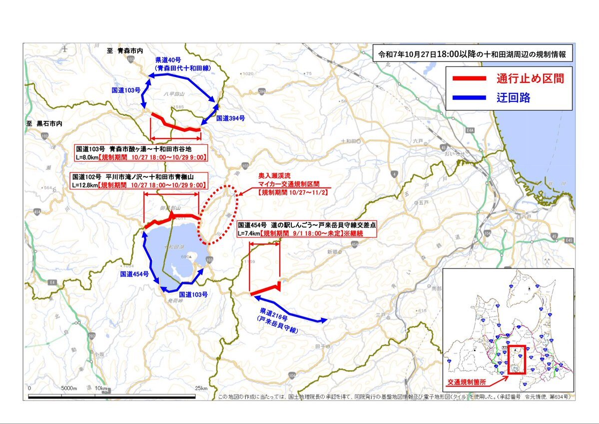 十和田湖周辺の交通規制状況をお知らせします。(10/29 9:00以降) ※国道103号(酸ヶ湯〜谷地)の通行止めは、本日9時に解除 なお、奥入瀬渓流におけるマイカー交通規制の詳細な内容はHPをご確認ください。 eco-oirase.com/ja x.com/aomoriken_dour…