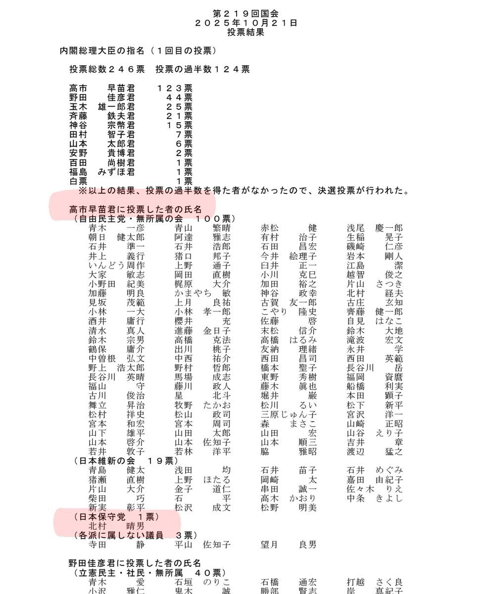 今日の 参議院議員の首班指名 1回目、北村弁護士 は、百田 日本 保守党首に入れとらんやんけ⁉️ これ 造反って言うやつちゃうんかい‼️ 高市早苗に入れているところなんて マジ感が出てるで❗️ sangiin.go.jp/japanese/touhy… #日本保守党 #造反議員 #北村晴男参議院議員 #次の党大会で党首交代か pic.x.com/g7Nv5161st