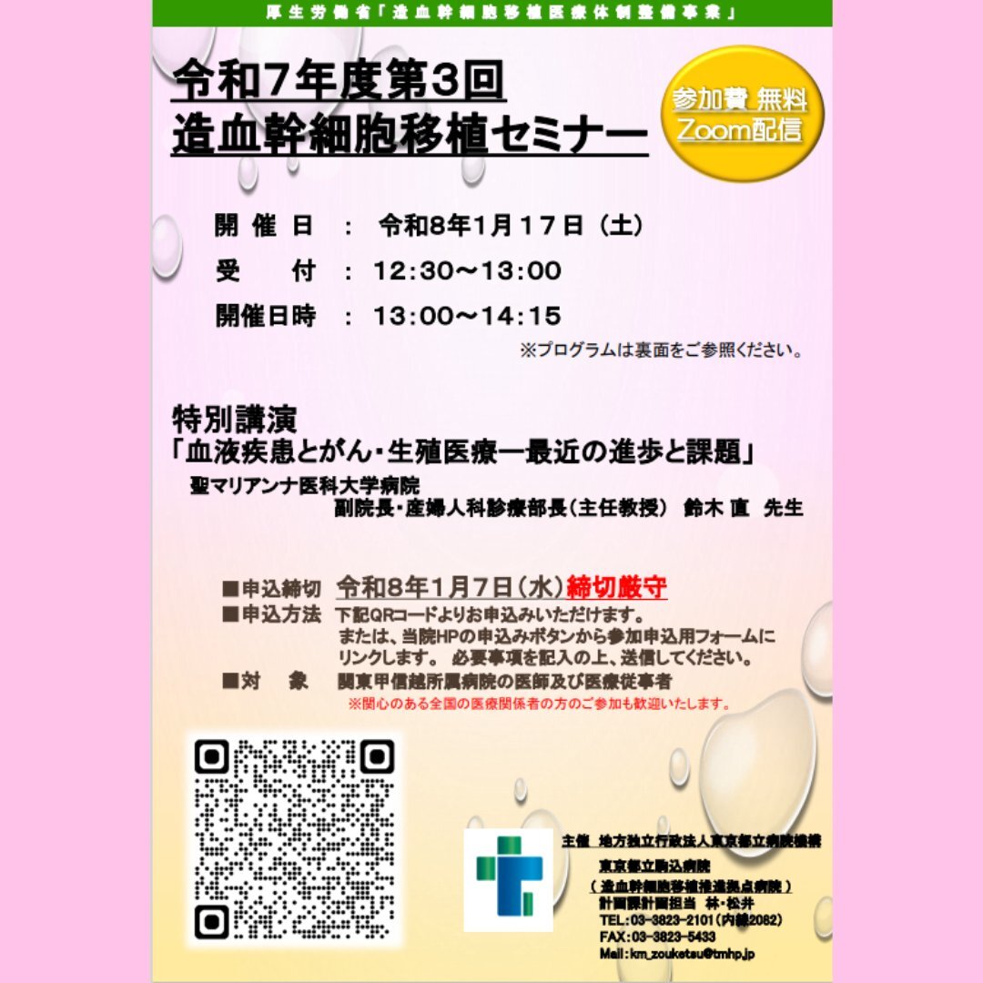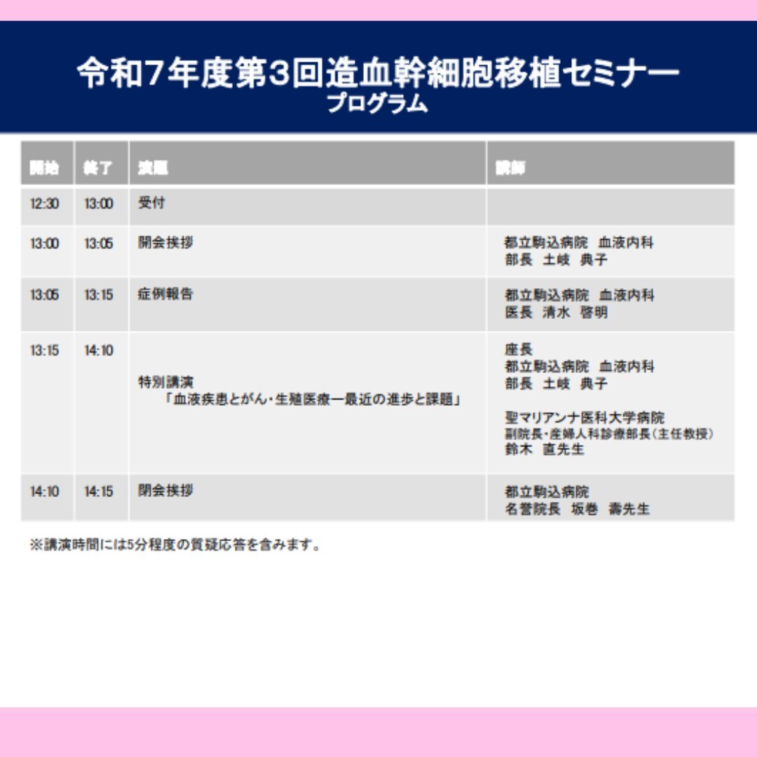 📢【2025年度 第3回 造血幹細胞移植セミナーのご案内】 今回は聖マリアンナ医科大学病院の鈴木直先生をお招きして特別講演を行います。医療関係者どなたでも歓迎! お申込のうえ、ぜひご参加ください!😊 詳細URL:tmhp.jp/komagome/zouke… #駒込病院_お知らせ #造血幹細胞移植 pic.x.com/8xMI19tWfk