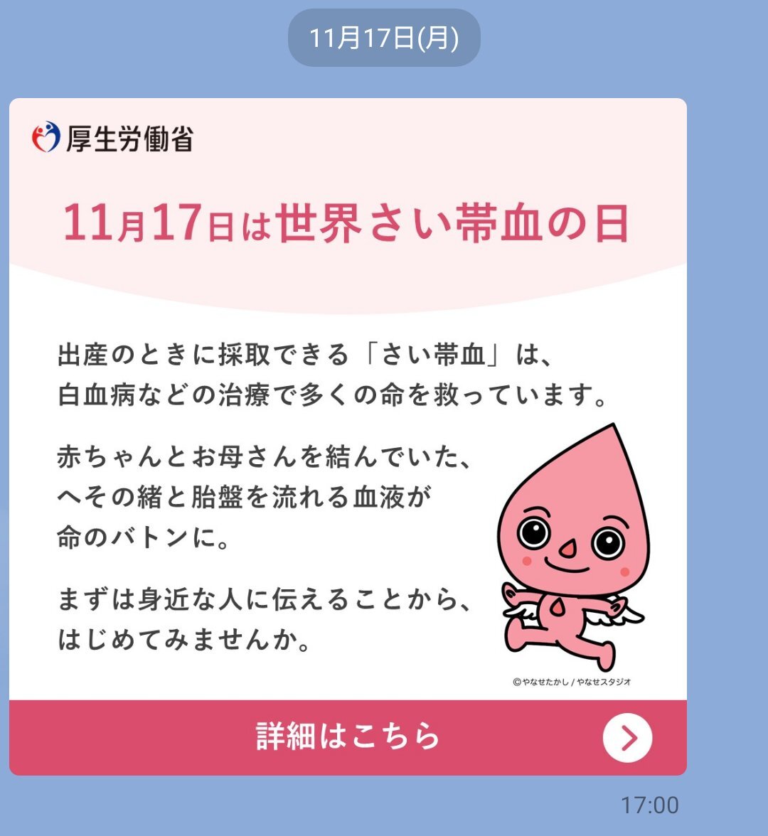 過ぎてしまいましたが・・・、 11月17日は世界さい帯血の日。『さい帯血は白血病等の治療で多くの命を救っています。』 これから出産を考えてるカップルは是非御検討を。 #さい帯血バンク、#造血幹細胞移植、 bs.jrc.or.jp/bmdc/generalpu… pic.x.com/LJHzlqKPA7