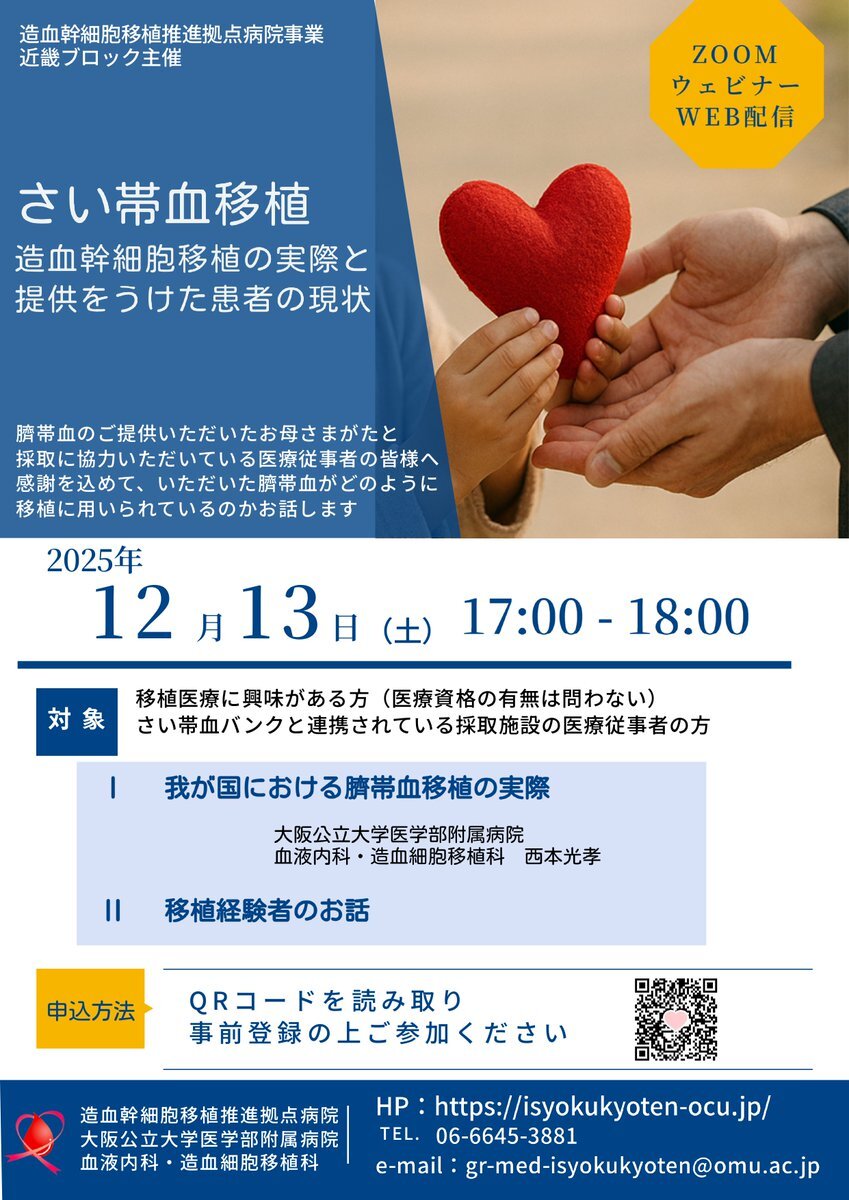 大阪公立大学医学部附属病院 様より 「臍帯血移植 造血幹細胞移植の実際と提供を受けた患者の現状」 日時:12/13(土)17:00-18:00 会場:Zoom 対象:移植医療に興味がある方(医療資格不問)、さい帯血バンクと連携している採取施設の医療従事者 詳細:x.gd/bNpih #造血幹細胞移植 pic.x.com/Dpk3mCTRwm