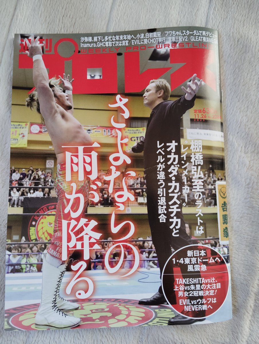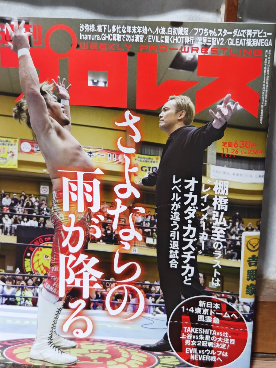 週プロGET! 激アツ表紙だね! 11/18の新宿FACEでの生ドラゴンノートFINALがほんとに楽しみだ! イープラスのチケットは締切になりましたが 棚ボタ応援チケットとはありますのでDM下さいね! どんな話が聞けるのか!? #週プロ #ドラノー #棚橋弘至 #新宿FACE #週刊プロレス pic.x.com/7QptksImJM