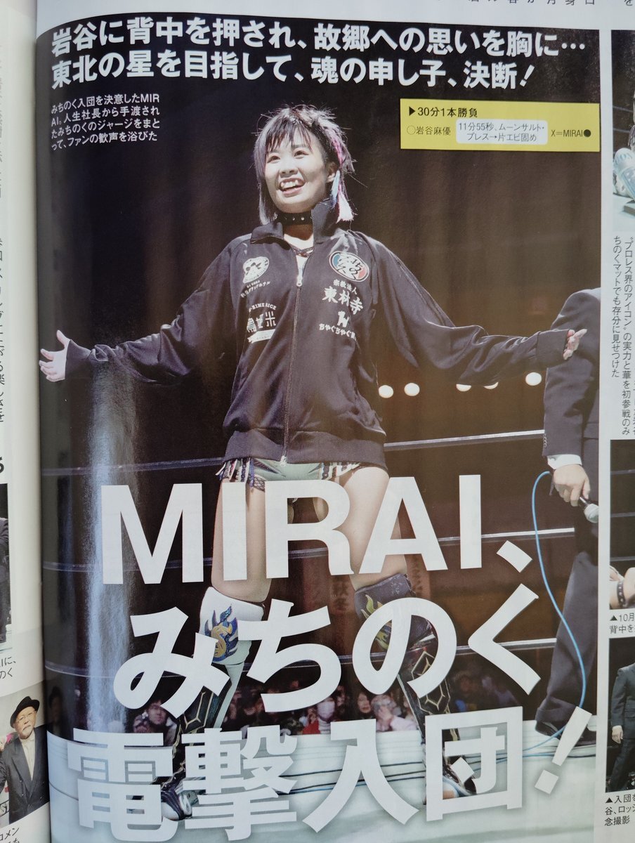 盛岡まで観に行った岩谷麻優vsMIRAI戦が載ってたので週プロ買ってきた☺️ みちプロ年間最大のビッグマッチなのに先週載せられなかったのかな?ページ数ももっと割いてほしかったし。新日本、全日本に次ぐ老舗団体なんだから。試合記事も記者名無しだしなぁ😐 #みちのくプロレス #週刊プロレス pic.x.com/DG0OPpYa9z