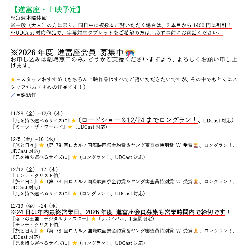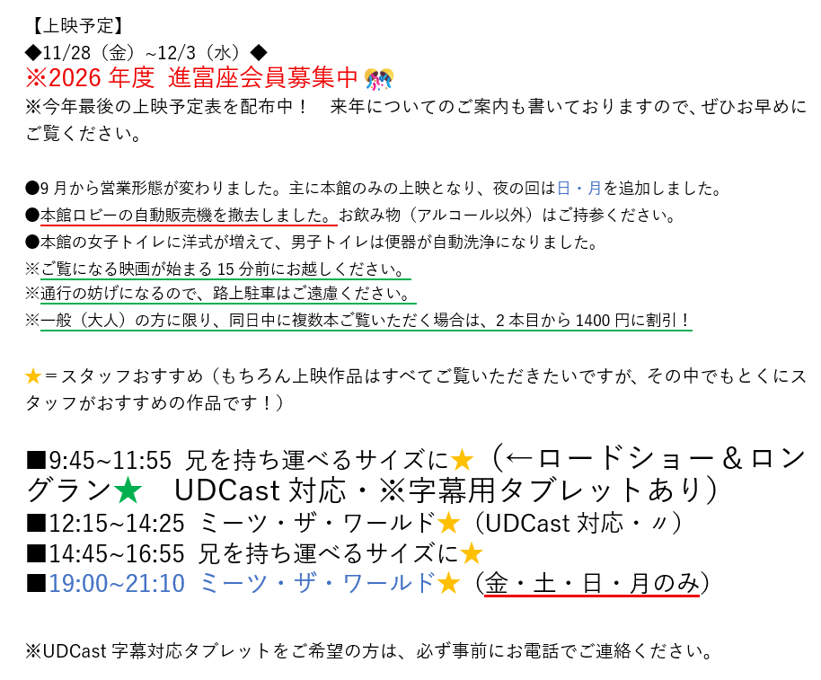 【~12月】 2026年度 #進富座 会員募集中🎊 詳細は画像2枚目へ🙇‍♀️ 来年1~2月の上映予定表を配布中🥳 見逃せない作品ばかりです🧐 ☑️必見⭐️#ミーツ・ザ・ワールド #兄を持ち運べるサイズに #旅と日々 #落下の王国 #伊勢 #映画館 #映画 #ミニシアター #ミーツザワールド #兄サイズ #映画旅と日々 pic.x.com/hbDlnbtmQE