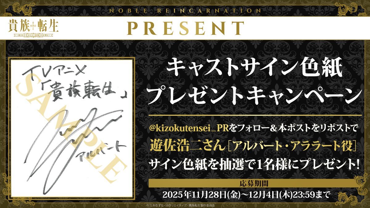 / TVアニメ『#貴族転生』 キャストサイン色紙 プレゼントキャンペーン開催!✨ \ 今週は… アルバート・アララート役 #遊佐浩二 さん👑 💎参加方法💎 1⃣ @kizokutensei_PR をフォロー 2⃣ この投稿をリポスト 📅応募期間 11月28日(金)~12月4日(木)23:59まで #kizokutensei pic.x.com/3yyyXkN8et