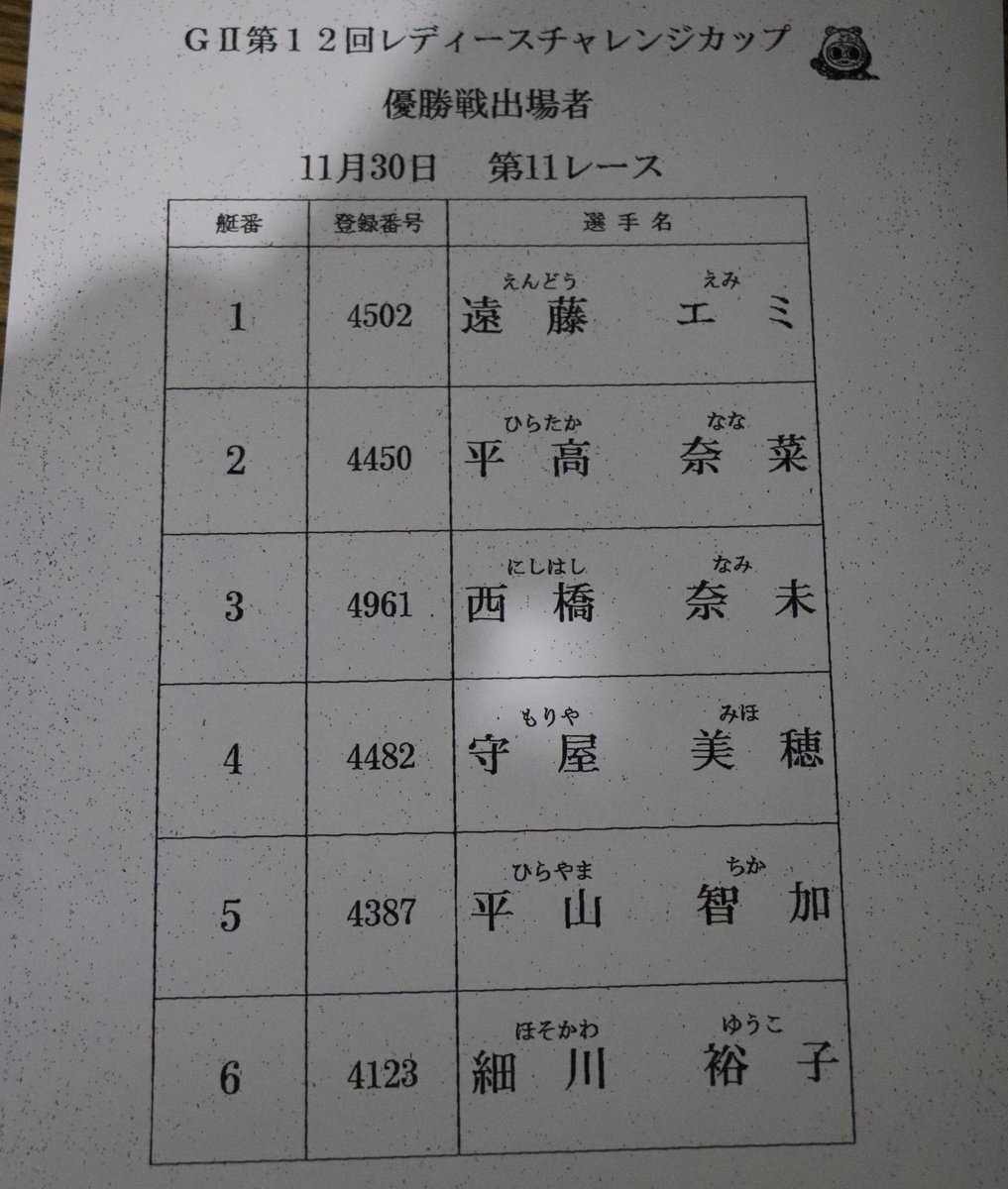 【福岡ボート・GⅡ #レディースチャレンジカップ 】#遠藤エミ は3着。大会5度目の優勝はならなかったが、賞金トップは揺るがず。 ① 遠藤エミ ②守屋美穂 ③平高奈菜 ④渡辺優美 ⑤鎌倉涼 ⑥川野芽唯 ⑦西橋奈未 ⑧浜田亜理沙 ⑨高憧四季 ⑩平山智加 ⑪小野生奈 ⑫実森美祐 pic.x.com/YAxAYJ8DEd