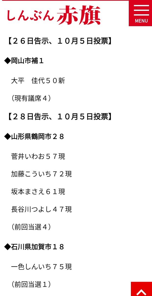 #選挙に行こう #選挙に行って政治を変えよう 10月5日投票の選挙の日本共産党の候補者さんです①📣 【26日告示、10月5日投票】 ◆#岡山市議補選 #大平かよ 【28日告示、10月5日投票】 ◆山形県 #鶴岡市議選 #菅井いわお #加藤こういち #坂本まさえ #長谷川つよし ◆石川県 #加賀市議選 #一色しんいち pic.x.com/p7bLAjXbXK x.com/IwakuniJCP/sta…