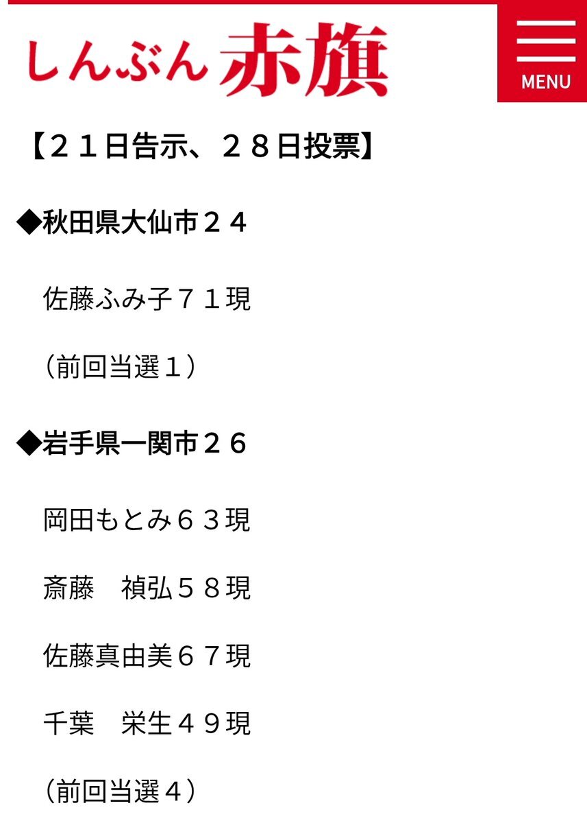 #選挙に行こう #選挙に行って政治を変えよう #自民党政治を終わらせよう 9月28日の選挙の日本共産党の候補者さん①です。 【21日告示、28日投票】 ◆秋田県 #大仙市議選 #佐藤ふみ子 ◆岩手県 #一関市議選 #岡田もとみ #斉藤よしひろ #佐藤まゆみ #千葉えいき pic.x.com/OWVfCauE00 x.com/IwakuniJCP/sta…
