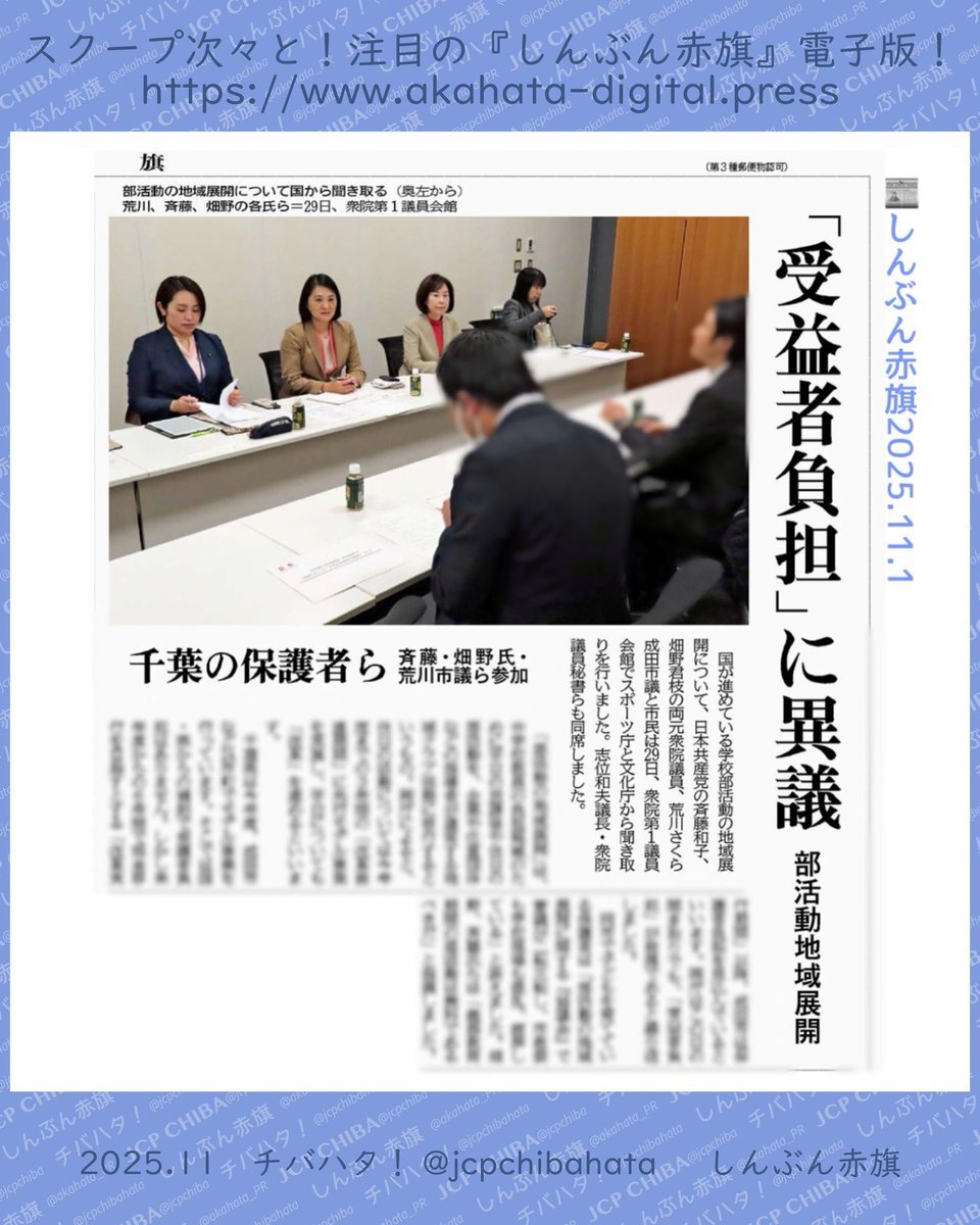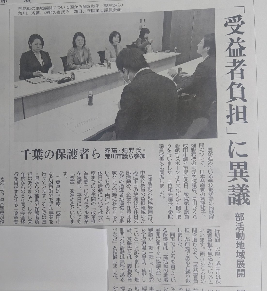 🏫畑野君枝@hatanokimie 、斉藤和子@saitokazuko 両元衆院議員らは「義務教育期間の部活動は無料であるべきだ」と指摘しました。 以上 #部活動地域展開 pic.x.com/zmTOLi5yIH
