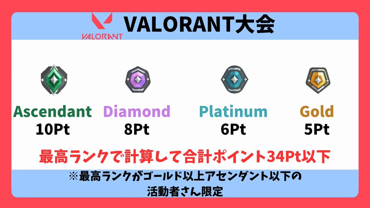 こちらの大会に参加させていただくことになりました!!! 当方アセンダントですので、最高ランク Diamond 1名 Platinum 1名 Gold 2名 の活動者さんを探しております! 気になる方いらっしゃったらDMください!! #VALORANT #VALORANTカスタム #配信者さんと繋がりたい x.com/potepote_2513/…