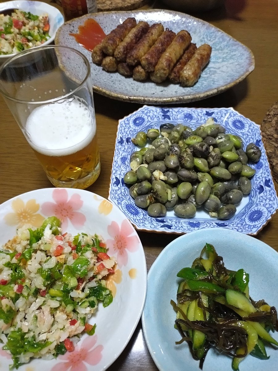 朝からあれこれ忙しくしていました。 夜は温泉に行って、ほっとしたところで一杯。幸せ♪ #おうちごはん #アメリカンポークソーセージ #ライスサラダ #きゅうりと塩昆布の浅漬け #里芋の煮物 #黒豆のガーリックソテー #郡山市 pic.x.com/bYU3prTaRc