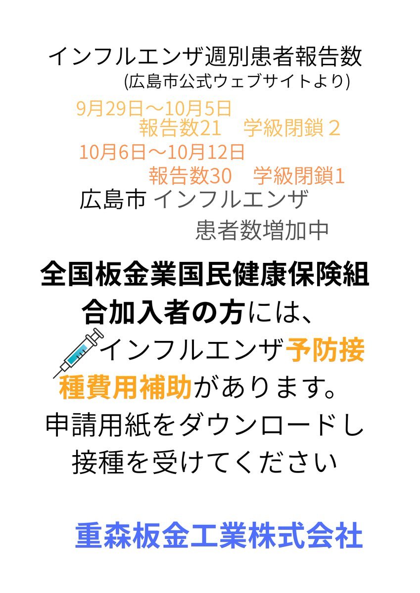 インフルエンザが流行ってきています。 自分のため、家族のために、一緒に働く仲間のために インフルエンザ予防接種💉 #重森板金工業株式会社 #インフルエンザ予防 pic.x.com/2ihq0sOzHp