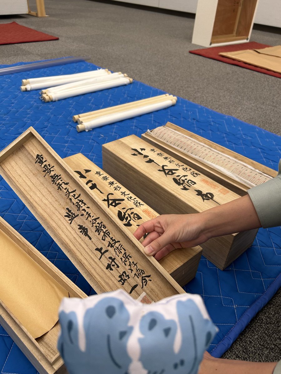 【日本の伝統美と技の世界】 丁重に準備中〜 お!? 箱に #重要無形文化財 小千谷縮布って書いてあるぞ〜!お宝だ〜🎵 箱の裏側には機屋さん(作った人)の名前が書いてあるんだって〜! 機屋さんて #朝ドラ の傳さんみたいな人なんだって〜 #新潟県立歴史博物館 #小千谷縮 #縮布 #伝統 #上信織物 pic.x.com/MMD6hmkgZf