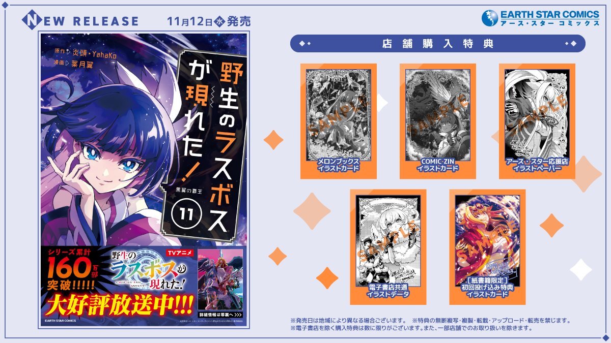 #野生のラスボスが現れた! 黒翼の覇王 11巻本日入荷‼️ #葉月翼 #炎頭 #YahaKo 応援店の特典ペーパー付です✨ x.com/comicearthstar…