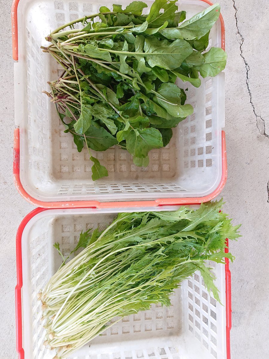 本日の収穫2 #水菜 さん #春菊 さん #ルッコラ さん #二十日大根 さん #ミニ大根 さん 娘が孫と来ると言うので少し多めに収穫 家の野菜でも喜んでくれるのは嬉しい😆 #ご馳走野菜 #野良仕事 #家庭菜園 #家庭菜園初心者 pic.x.com/OtfwUwQ2pj