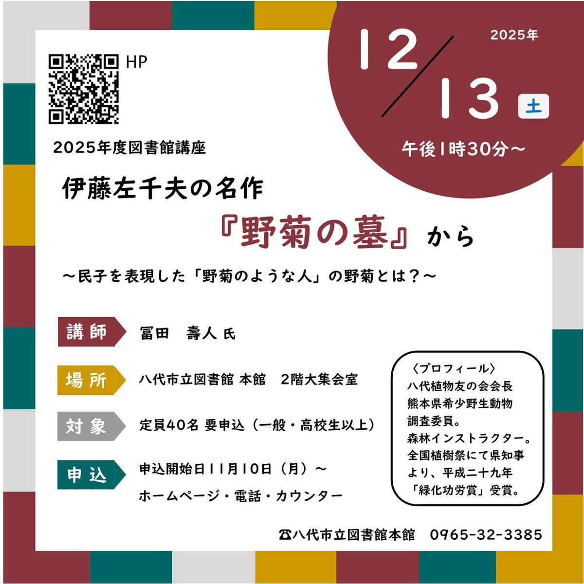 八代市立図書館本館にて、図書館講座「伊藤左千夫の名作『野菊の墓』から 民子を表現した「野菊のような人」とは?」を開催します。 講師は、八代植物の会会長 冨田 壽人 氏です。 皆様のご参加をお待ちしております。  #八代市立図書館 #図書館 #植物 #野菊の墓 #伊藤左千夫 pic.x.com/Gedz2Fs15y