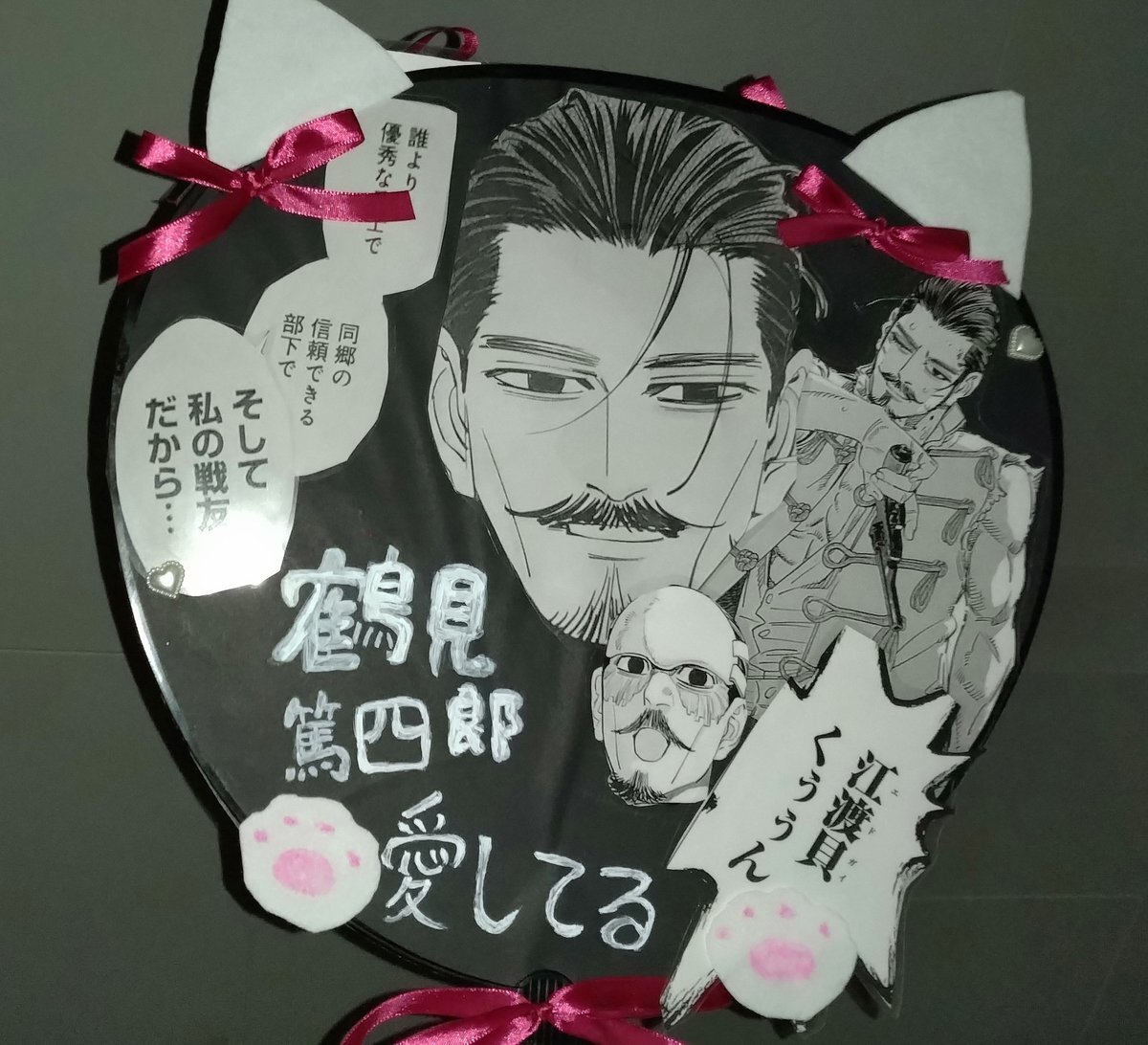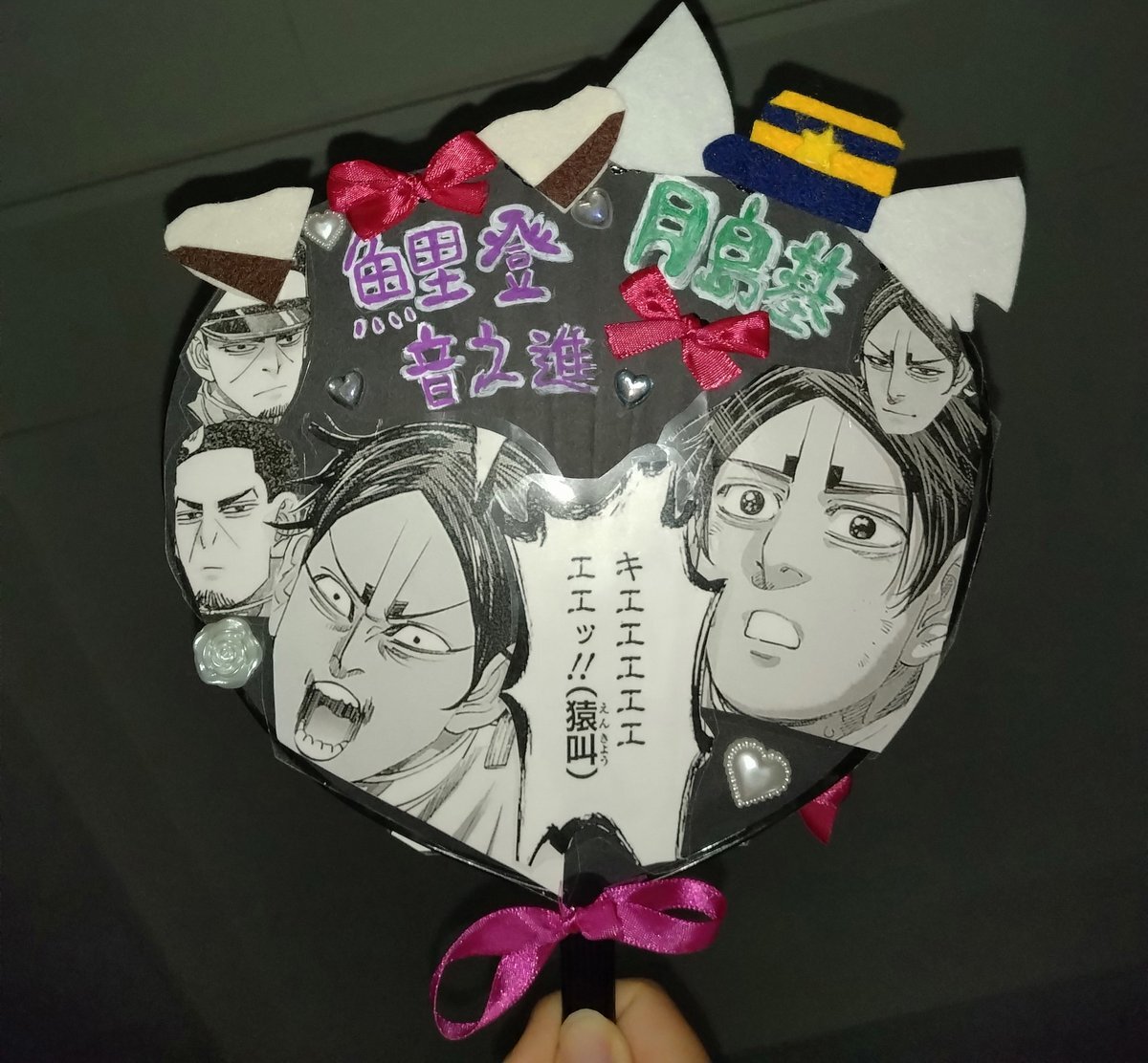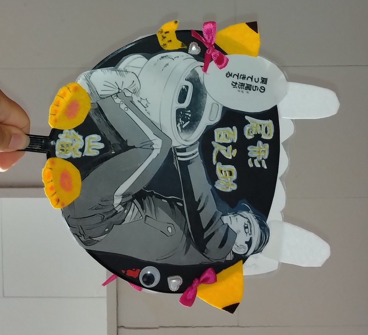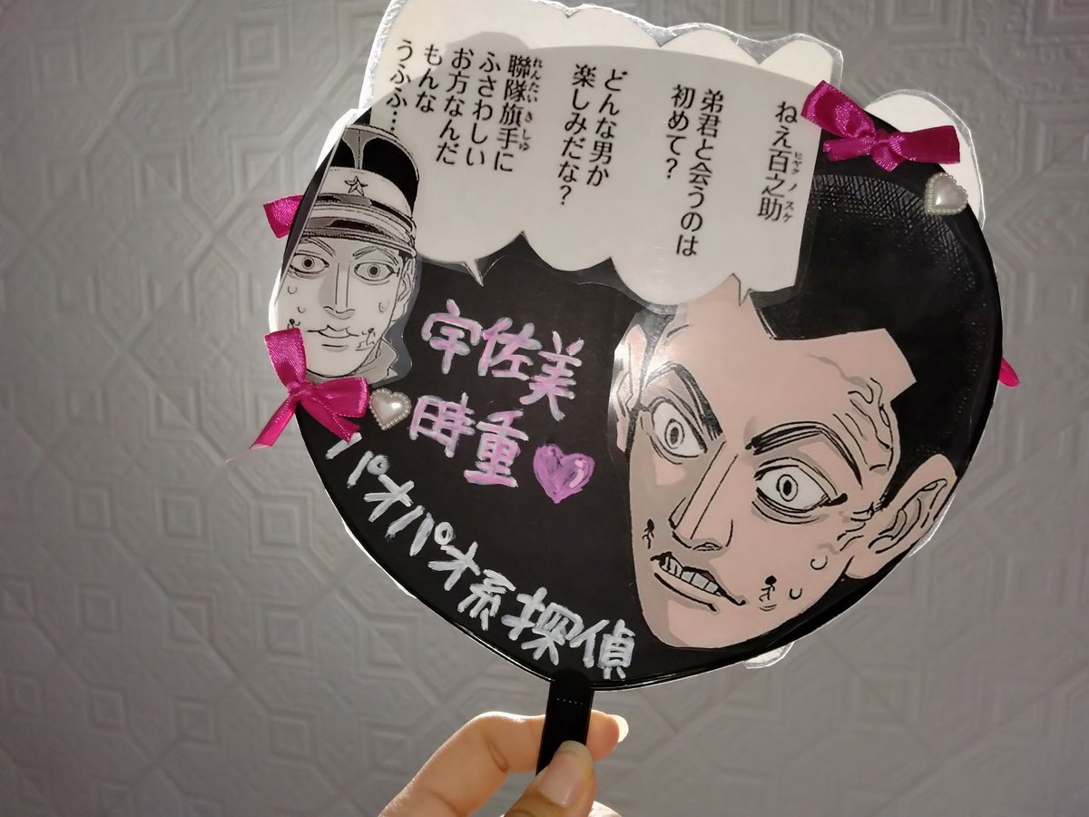 とりあえず今日は3時間くらい作業してみた!明日か今日ぶっ通しでやるかで悩むけどとりあえず大体は完成💕 名前をもっとキラキラにしたりうちわのデコ極めます #金カム好きさんと繋がりたい #ゴールデンカムイ pic.x.com/rw3c004wDE