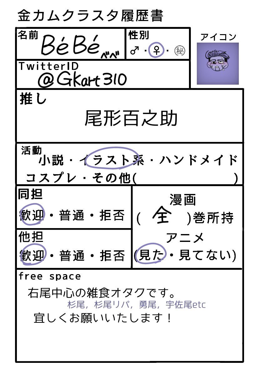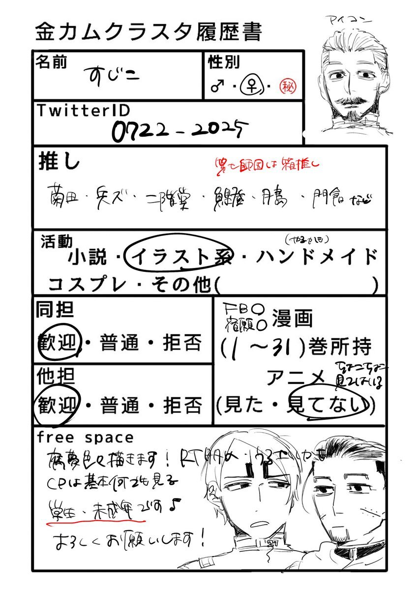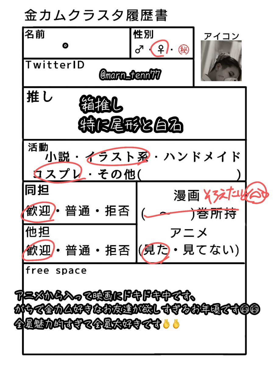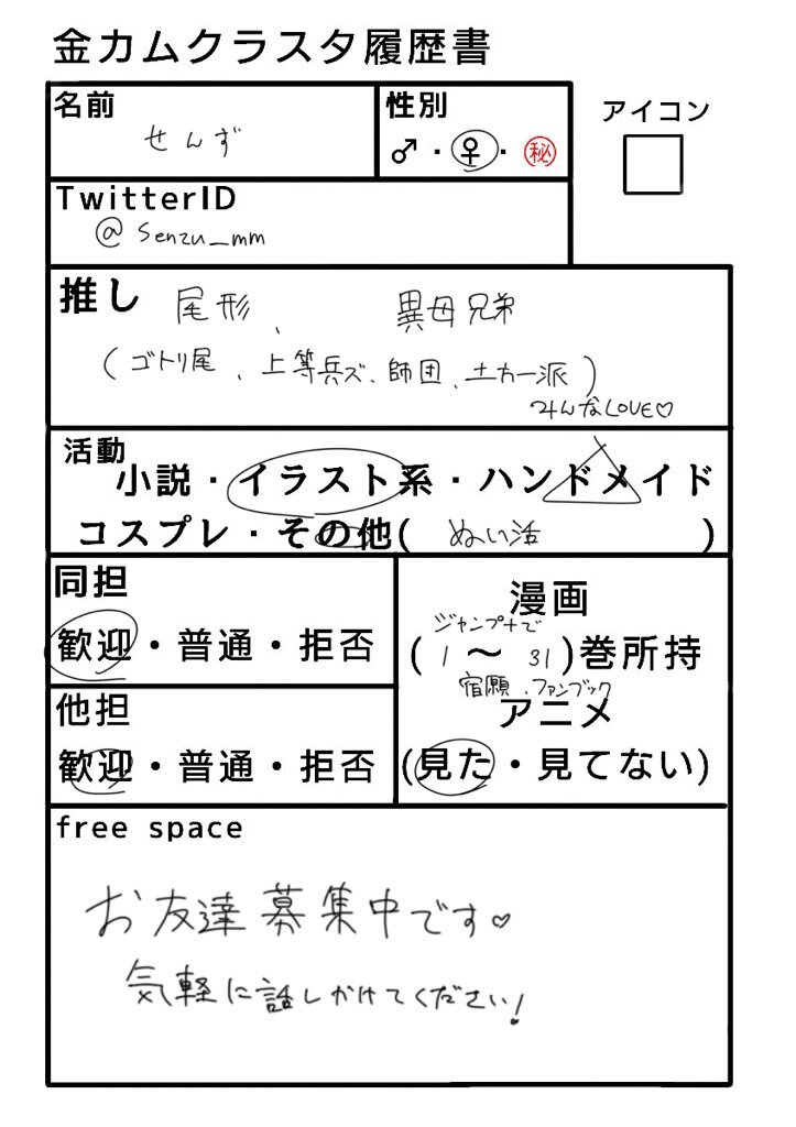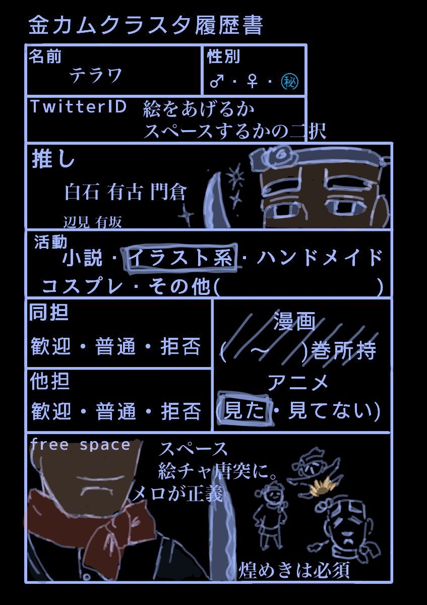 やっと書いたのでぜひ🙌🙌🙌 いいねしてくれた方で気になった人をフォロー行きます🙇‍♀️ #金カムクラスタ履歴書 #金カム好きさんと繋がりたい pic.x.com/Ix8dKLP43h