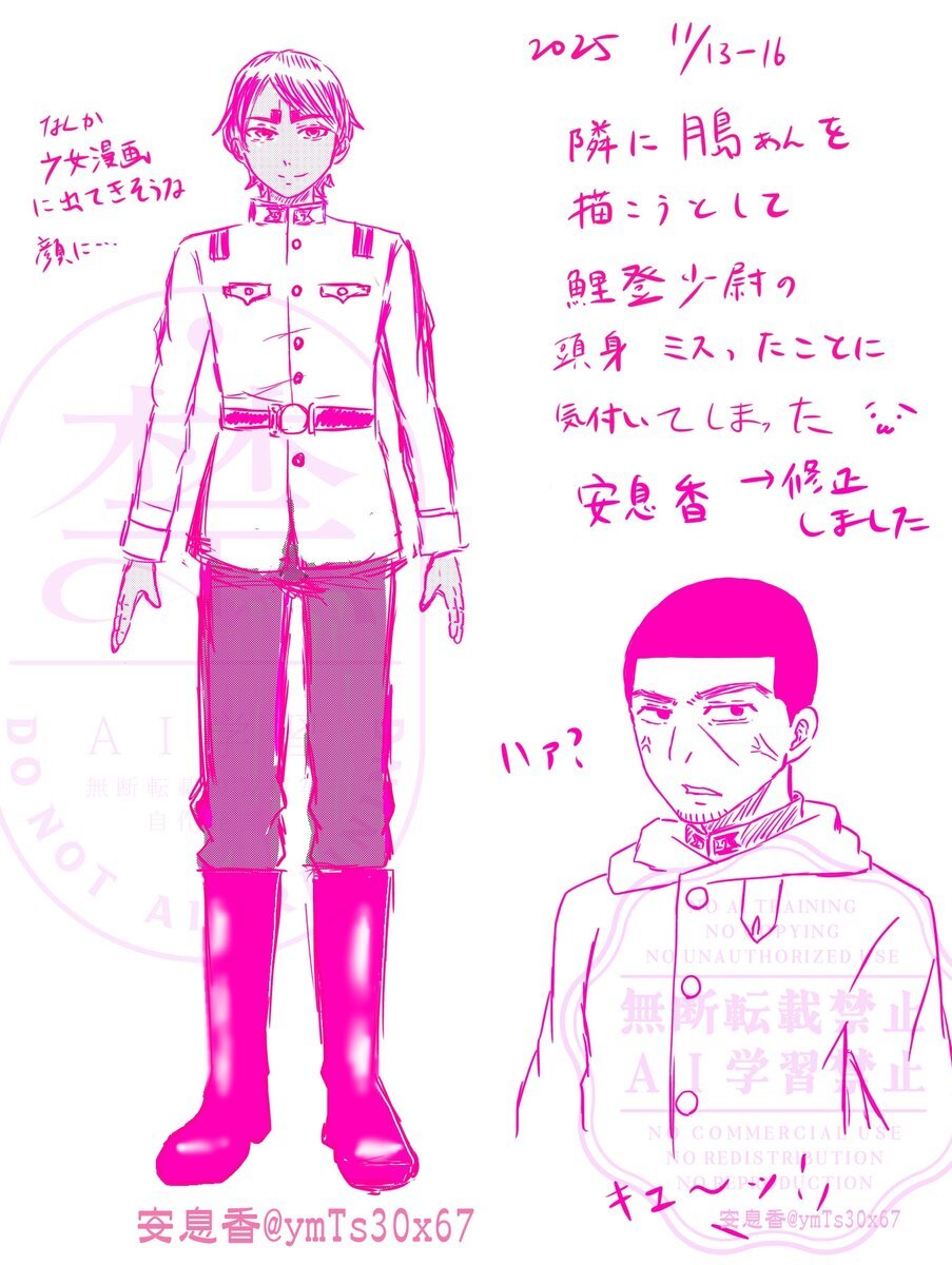 これは鯉登少尉と月島軍曹を並べて描こうとして、最初に鯉登少尉の頭身をミスったせいで並べて描くことができずブチ切れる月島ぁんの図 (月島描いた後に鯉登少尉修正した) ※タグ追加のため再アップ #金カム #金カム好きさんと繋がりたい #金カム絵描きさんと繋がりたい pic.x.com/fLa2eE8SNK