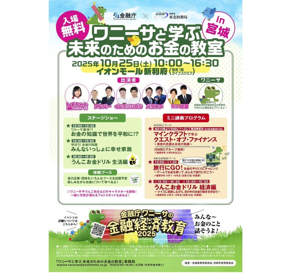 / ワニーサと学ぶ 未来のためのお金の教室in宮城 \ 10月25日(土)にイオンモール新利府で親子向けの金融経済教育イベントを開催します! ▼詳しくはこちら wanisa-caravan.fsa.go.jp/event/miyagi/ #金融庁 #東北財務局 #ワニーサ #金融経済教育 #お金の知識 #親子イベント #おでかけ pic.x.com/lpqRZQamuv