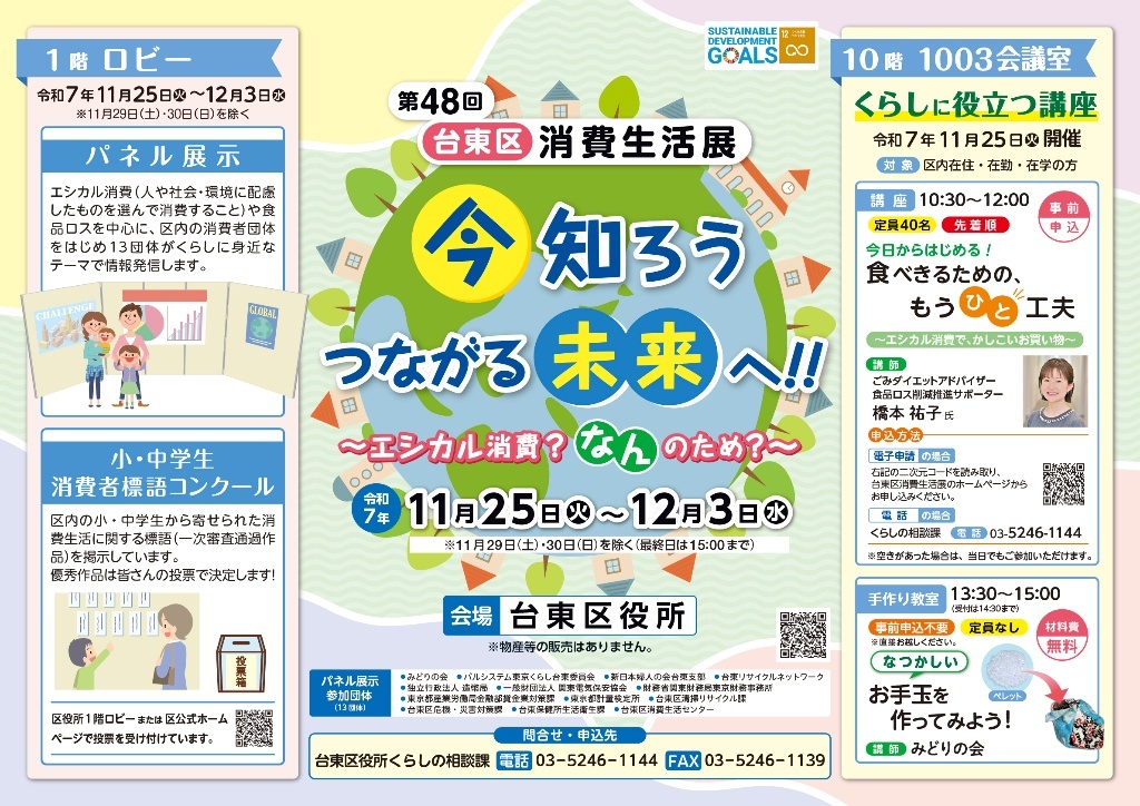 第48回台東区消費生活展「今知ろう つながる未来へ!!」~エシカル消費?なんのため?~ 消費生活に関するパネル展示や標語コンクール、講座等を開催します。 期間:11月25日(火)から12月3日(水) ※土日除く 時間:8時30分から17時(最終日は15時) 会場:台東区役所 city.taito.lg.jp/kurashi/shohis…
