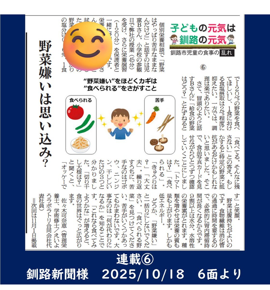 #釧路新聞 様の新連載を担当しています。 #子どもの元気は釧路の元気 #釧路市児童の食事の乱れ 連載⑥『🥦野菜嫌いは思い込み?』 Bさん親子の「食べられる野菜結構あった❣️」が心に残りました。 @eiyolabo #えいようラボラトリ合同会社 #管理栄養士 #釧路市こどもの健康応援プロジェクト #栄養教育 pic.x.com/R7TwAyF61d
