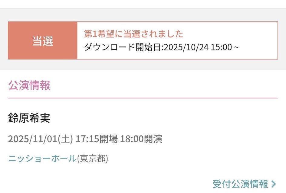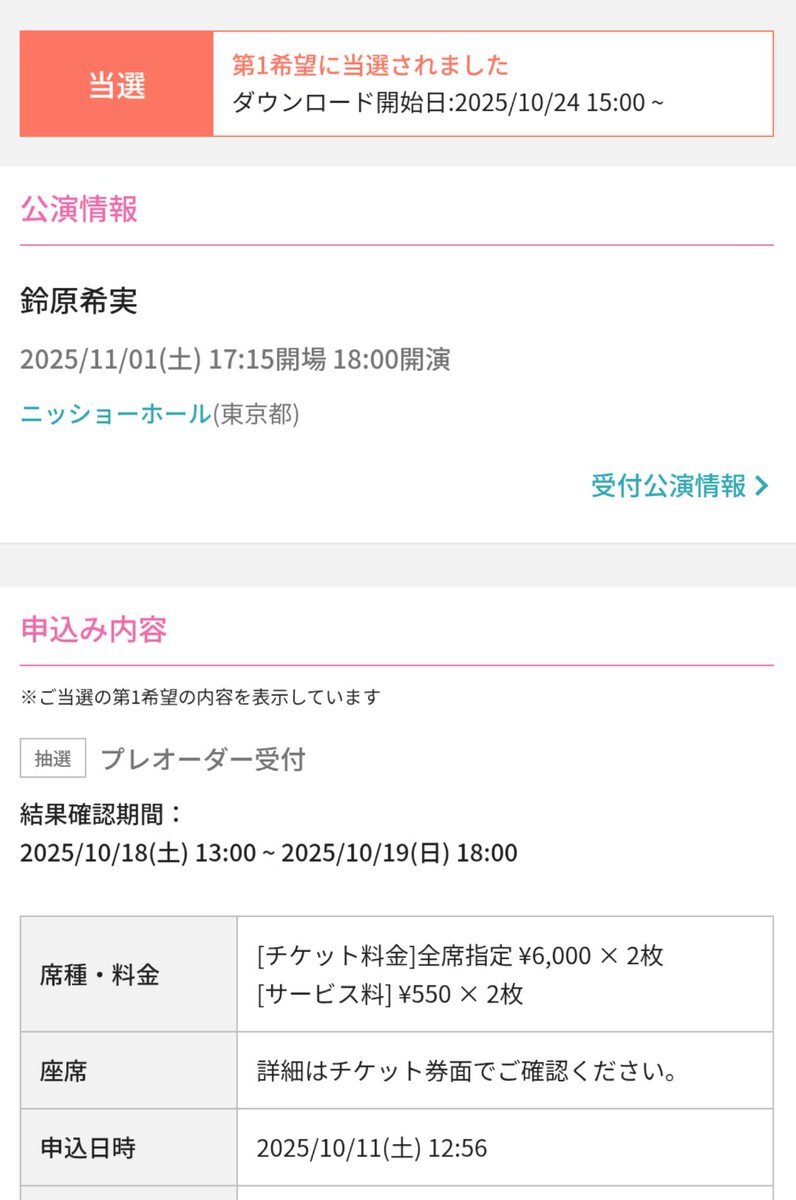 片方だけでも、当たった〜 良かった〜 両方行きたかったが、しょうがない。 誕生会初参加出来て嬉しいな☺️ 支払いしてこよう💸 #鈴原希実のカワイイ誕生会2025 pic.x.com/9nU27DYz8F