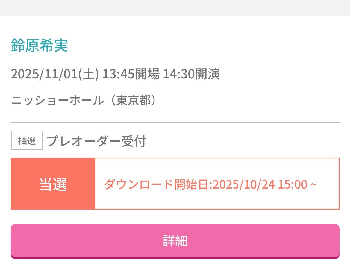 ⚠️本日締切⚠️ #鈴原希実 の夢はカワイイなんばーわん♡誕生会2025 プレイガイド先行 11/1(土) ニッショーホール 昼公演 13:45開場/14:30開演 夜公演 17:15開場/18:00開演 受付期間 10/11(土)正午~10/16(木)23:59 apollobay.jp #鈴原希実のカワイイ誕生会2025 @NozomiSuzuhara