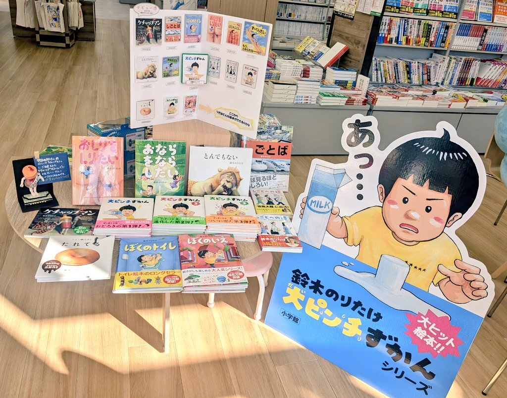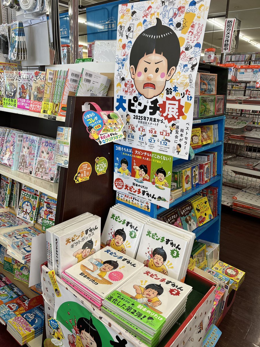 児童書たんとうSです 暑い! こちらもアツいですよ😉 只今大阪では 鈴木のりたけ『大ピンチ展!』 開催中ですね!平日でも子どもたちで賑わってました😄 店頭では、デビュー作から歴代の絵本たちをご紹介。ぜひ見てみてね! #夏だアツいぞ大ピンチ #大ピンチずかん店頭装飾コンクール #小学館