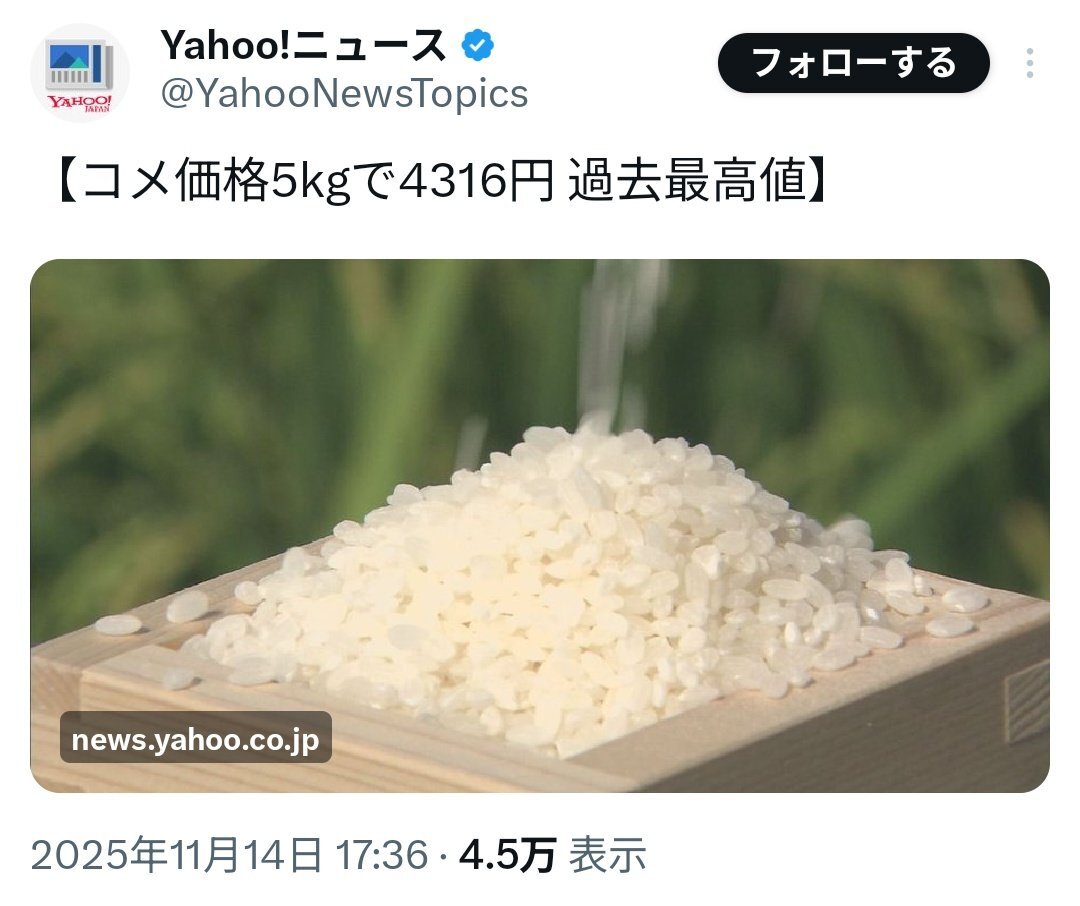 コメ価格5kgで4316円 過去最高値 2025年11月14日 news.yahoo.co.jp/pickup/6558946 #米価格過去最高値 #鈴木憲和 を農林相にした高市総理の責任、口を開けば「おこめ券」しか言わない他に何も出来ない無能大臣