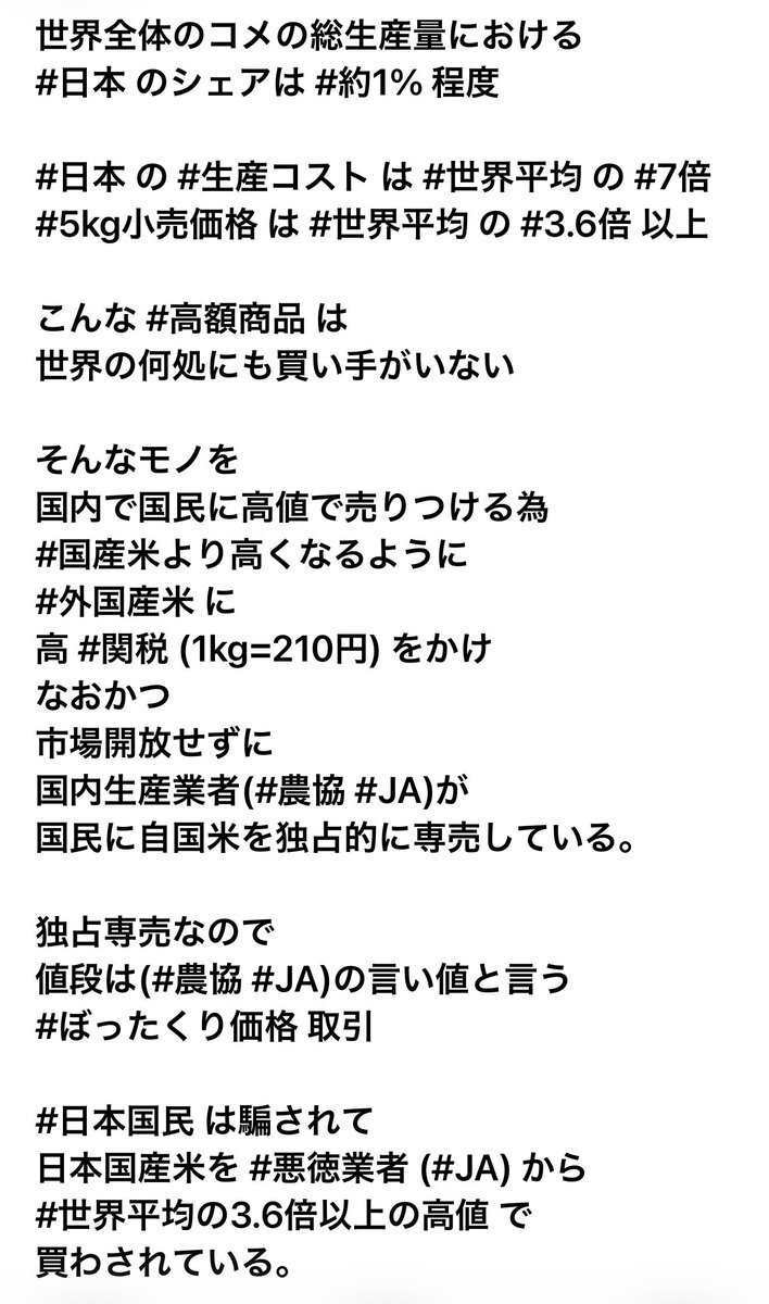 返信先:@YahooNewsTopics#日本#生産コスト#世界平均#7倍 #5kg小売価格#世界平均#3倍以上 そんなモノを 国内で国民に高値で売りつける為 #国産米より高くなるように #外国産米 に 高 #関税 をかけ #農協 #JA が 国民に自国米を独占的に専売 国民は #ぼったく られてる #鈴木憲和 #農林水産大臣 pic.x.com/YZFrprNF1s