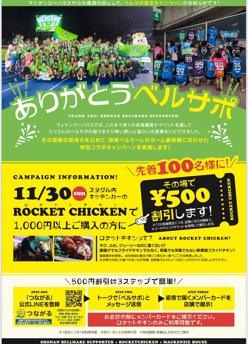 ありがとうベルサポの皆様🙇‍♂️ マッケンジーハウスから“感謝”の気持ちを込めて🫡 ロケットチキンが【実質◯◯円】に!?🔥 ⸻ 残り3試合! 今シーズンもたくさんの応援をありがとうございました! 袖スポンサーからパンツロゴまで、湘南ベルマーレと共に歩んだ、マッケンジーハウスより感謝を込めて🎁 x.com/matsushita_mh/…