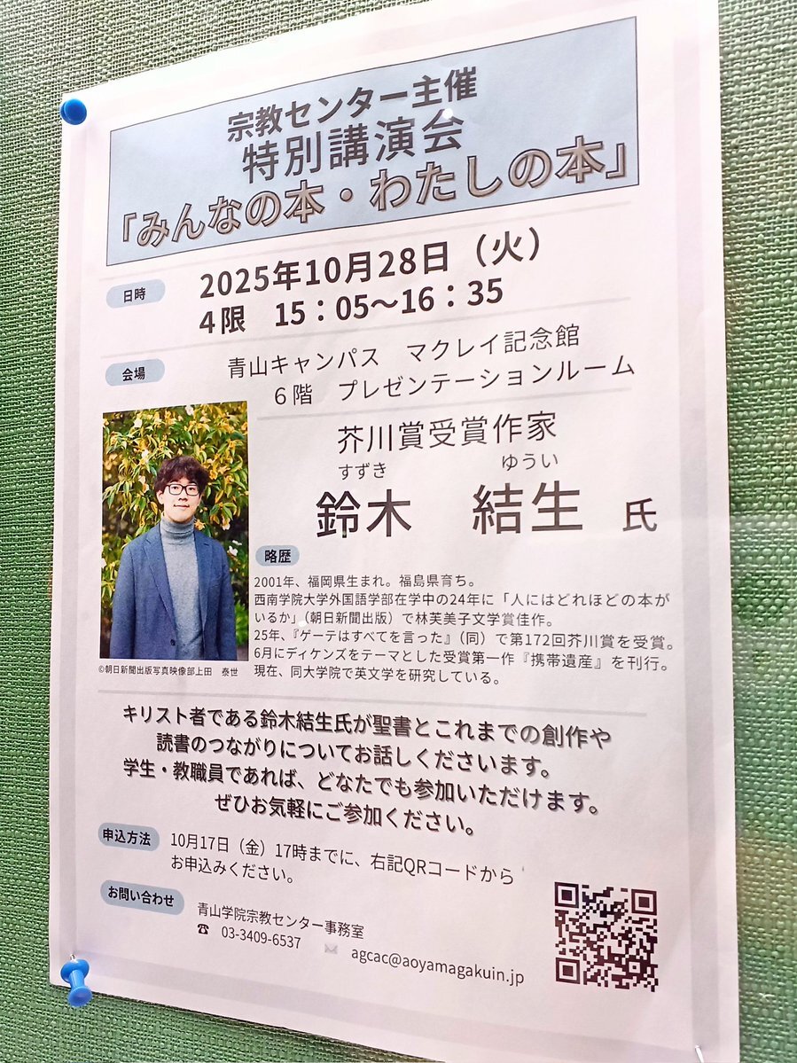 福岡の尊敬する先輩である #芥川賞 作家・ #鈴木結生 さんの講演会に伺いました📖 ゲーテやキリスト教のお話、とても興味深く拝聴しました✨️ ユーモアに包まれた温かな時間で、刺激をたくさんいただきました🙂↕️ 自分の「好き」と向き合う大切さを改めて学ばせていただきました🍇 #青山学院大学 pic.x.com/VysyCOP88Y