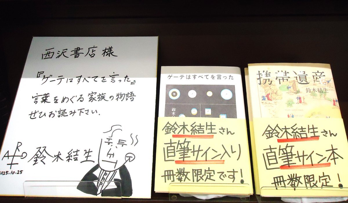 #鈴木結生 さんより、直筆サイン色紙をいただきました~✨さらに著書「ゲーテはすべてを言った」「携帯遺産」にもサインをいただきました!冊数限定の貴重なサイン本です。お求めは #西沢書店 まで! pic.x.com/UiFm8bdlr8