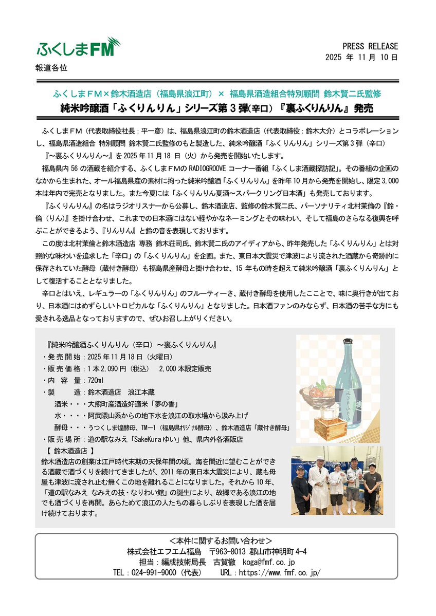 ◤ ̄ ̄ ̄ ̄ ̄ ̄ ̄ ̄ ̄ ̄ ̄ ̄ ̄ 🌘新商品🌔 純米吟醸酒『#裏ふくりんりん』 ✨11/18(火) 発売✨ _____________◢ #ふくしまFM × #鈴木酒造店 × 福島県酒造組合 #鈴木賢二 特別顧問 監修の コラボ日本酒 第3弾🍶 華やぐキレをお楽しみください✨ ⏩ iwakikotobuki-namie.com/%e3%81%b5%e3%8… pic.x.com/D1Rve3Ml9d