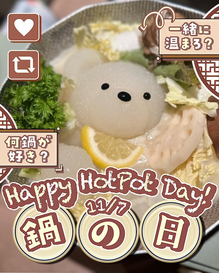 立冬の今日は #鍋の日 及び #鍋と燗の日 みたいですね 🍲🍶 あったかい鍋と共に日本酒を書き込みたいですねぇ… ここで可愛くて無情なくまちゃん温泉鍋見てください( ◍•㉦•◍ )♡ #今日は何の日 #しばりええごはん pic.x.com/RLKMKx4U3b