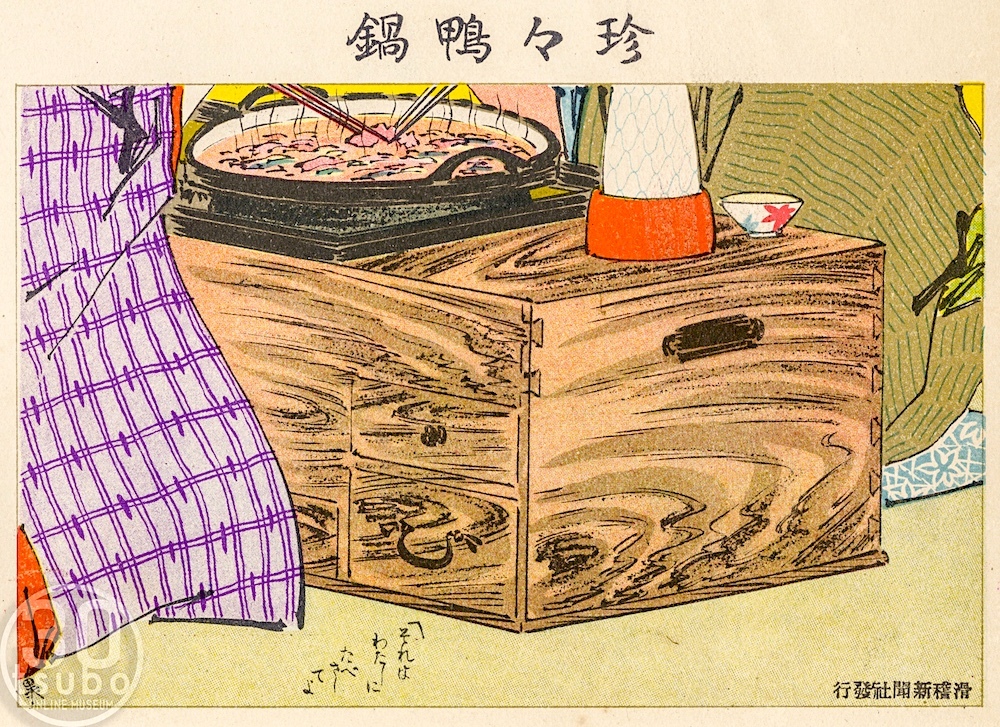 明治40年(1907) 滑稽新聞・絵葉書世界より「珍々鴨鍋」 男女が仲睦まじく熱々の鴨鍋をつついています.... #鍋の日 #鍋と燗の日 #滑稽新聞 #絵葉書世界 #宮武外骨 #イラスト #絵葉書 pic.x.com/BHaOQ7M9yW